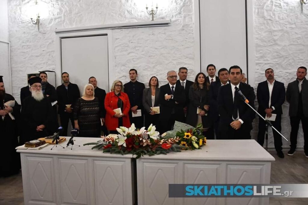 Στην κατάμεστη αίθουσα του Δημοτικού Συμβουλίου στο Μπούρτζι, την Τετάρτη 20 Δεκεμβρίου 2023, πραγματοποιήθηκε η ορκωμοσία του νέου Δημάρχου Σκιάθου Θοδωρή Τζούμα και των μελών του νέου Δημοτικού Συμβουλίου.