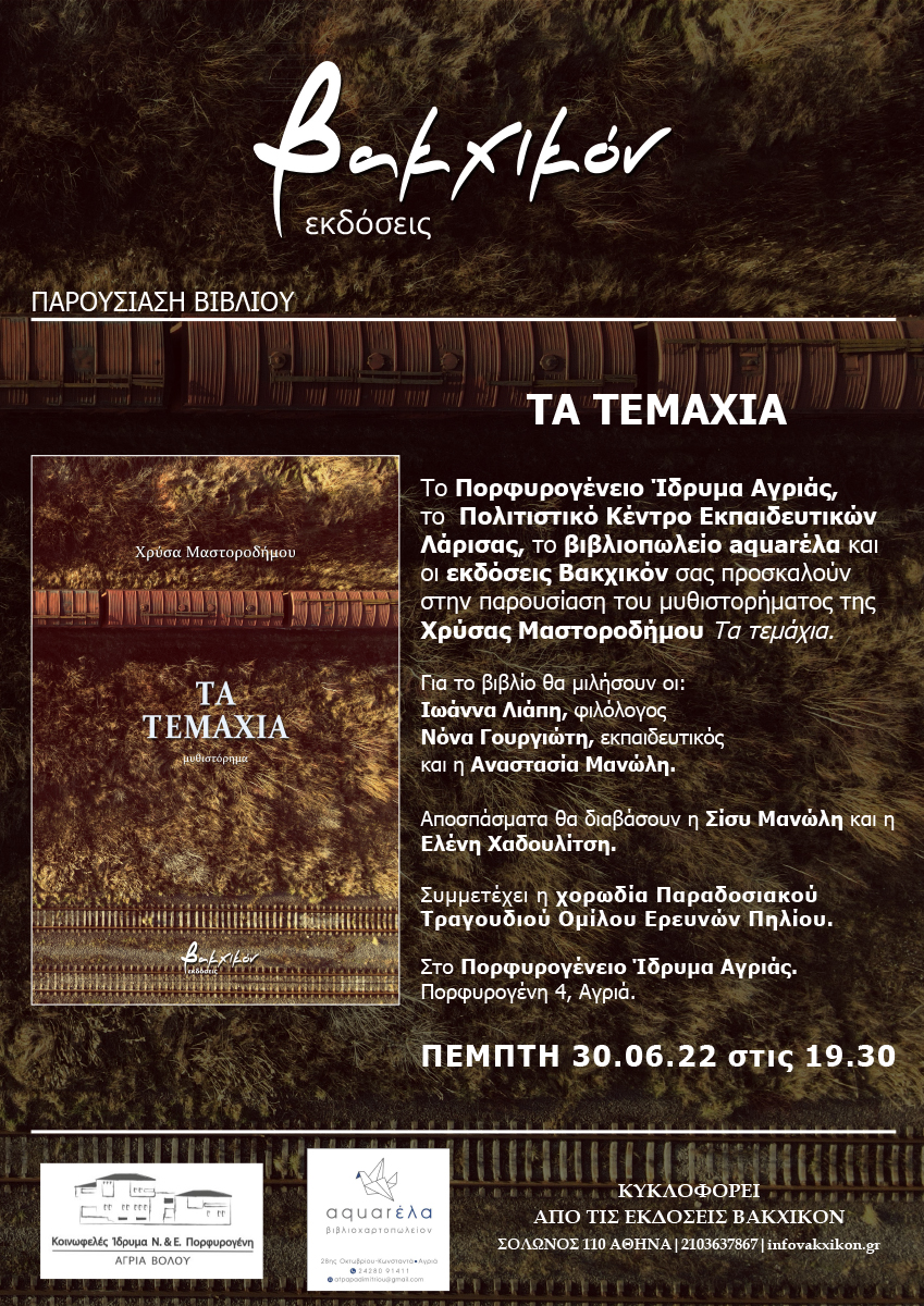 Το Πορφυρογένειο Ίδρυμα Αγριάς, το Πολιτιστικό Κέντρο Εκπαιδευτικών ν. Λάρισας, το βιβλιοπωλείο aquarέλα και οι εκδόσεις Βακχικόν σας προσκαλούν στην παρουσίαση του μυθιστορήματος ΤΑ ΤΕΜΑΧΙΑ, της εκπαιδευτικού Μαστοροδήμου Χρύσας στο Πορφυρογένειο Ίδρυμα Αγριάς (Πορφυρογένη 4), την Πέμπτη 30 Ιουνίου στις 7:30 μ.μ.