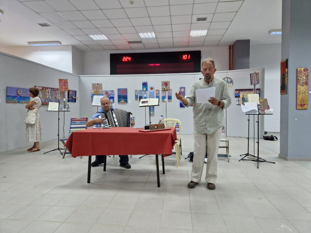 Στην έκθεση μου στου λιμανιου του Βόλου στην Άκρη ,βρίσκονται λόγια ποιητών σε εικόνες .από τον ποιητή Νίκο ΒΑΡΑΛΗ σκουστηκαν ποιήματα διαλεγμένα από την ελληνική ποιητική προίκα,κληρονομιά και θα θολώνει το τοπίο με ήχους ακκορντεον ο εκτειθεμενος εικαστικός .
