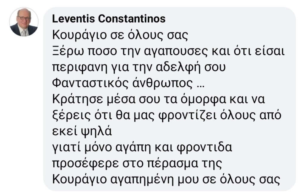 “Μερικές φορές δεν χρειάζεται να πεις πολλά,μόνο να ξέρεις ΜΑΝΑ πως είμαι περήφανος που είμαι παιδί σου,θα ζήσεις πάντα στην καρδιά μου. Εύχομαι ο Ανδρέας μας, εκτός από το όνομα σου, να πάρει όλες τις χαρές σου,σ αγαπάω ΜΑΝΑ!” έγραψε ο γιος της, ενώ η αδερφή της επέλεξε το τραγούδι από τις συνταγές μαγειρικής για τον αποχαιρετισμό της , μιας και κουζίνα ήταν η δεύτερη φύση της.