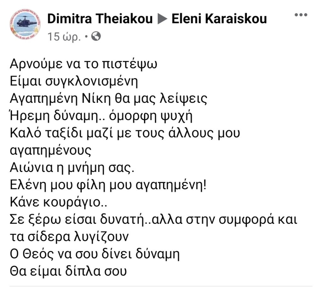 Νίκη θέλω να γράψω πολλά για σένα αλλά δεν μπορώ άλλο! Ακόμη και αυτές τις δύσκολες μέρες η σκέψη σου ήταν στο Κρίτσα. Όλοι μας η οικογένεια σου και οι συνάδελφοι σου αύριο θα σε αποχαιρετήσουμε με πόνο στην καρδιά“