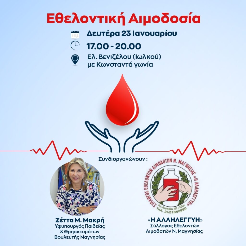 Η υφυπουργός Παιδείας και βουλευτής Ν. Μαγνησίας κα Ζέττα Μ. Μακρή και ο σύλλογος εθελοντών αιμοδοτών “Η Αλληλεγγύη” ενώνουν τις δυνάμεις τους και συνδιοργανώνουν, τη Δευτέρα 23 Ιανουαρίου απο τις 17.00 εως τις 20.00, την 8η εθελοντική αιμοδοσία που θα πραγματοποιηθεί στον εξωτερικό χώρο του πολιτικού γραφείου της υφυπουργού, Ελ. Βενιζέλου (Ιωλκού) και Κωνσταντά.