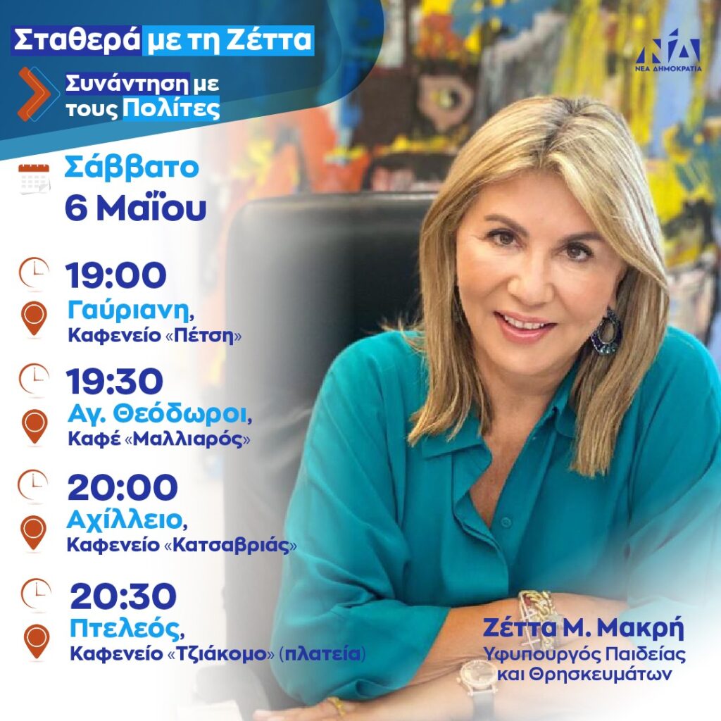 Η Υφυπουργός Παιδείας και Θρησκευμάτων και υποψήφια βουλευτής Ν. Μαγνησίας Ζέττα Μ. Μακρή περιόδευσε σε Κροκιό, Αϊδίνι, Νέα Αγχίαλο και Μικροθήβες και συνάντησε την αμέριστη υποστήριξη του κόσμου, που συνεχίζει να την εντυπωσιάζει και να την εκπλήσσει σε κάθε μέρος που επισκέπτεται.