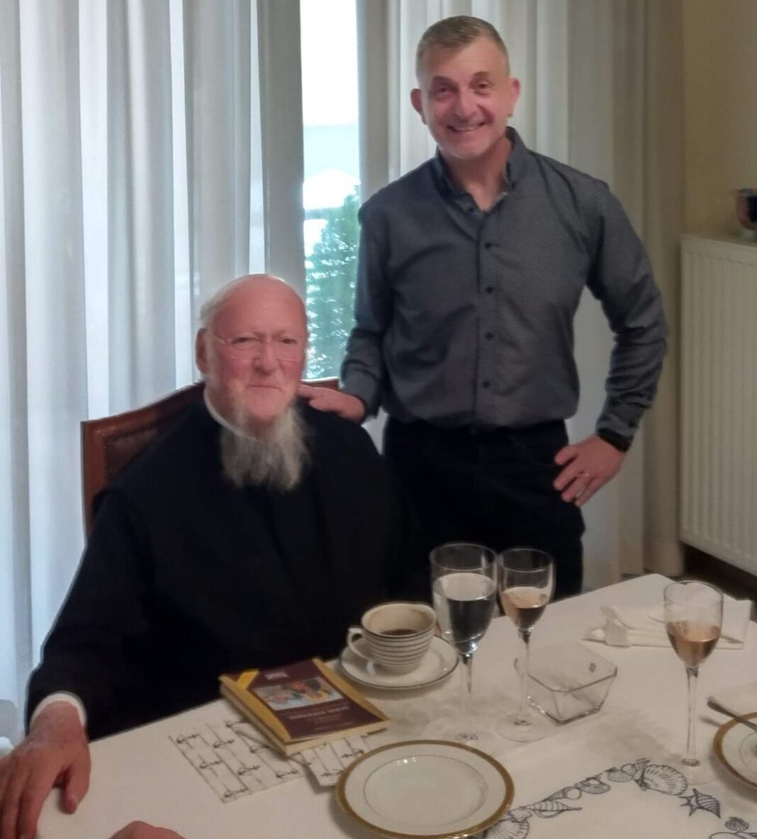 Ο.Πατριαρχγς Βαρθολομαίος έφτασε νωρίς το μεσημερι στον Βόλο. Ο λόγος ήταν γιατί είχε αποδεχτεί πρόσκληση να γευματίσει ιδιωτικά στο σπίτι φίλης του Ίμβριας Βολιώτισσας η οποία είχε ετοιμάσει τραπέζι δέκα ατόμων. Μεταξύ αυτών και ο συγγραφέας Διονύσης Λεϊμονής ο οποίος έβγαλε και φωτογραφία με τον Πατριάρχη στον οποίο χάρισε το τελευταίο του βιβλίο.