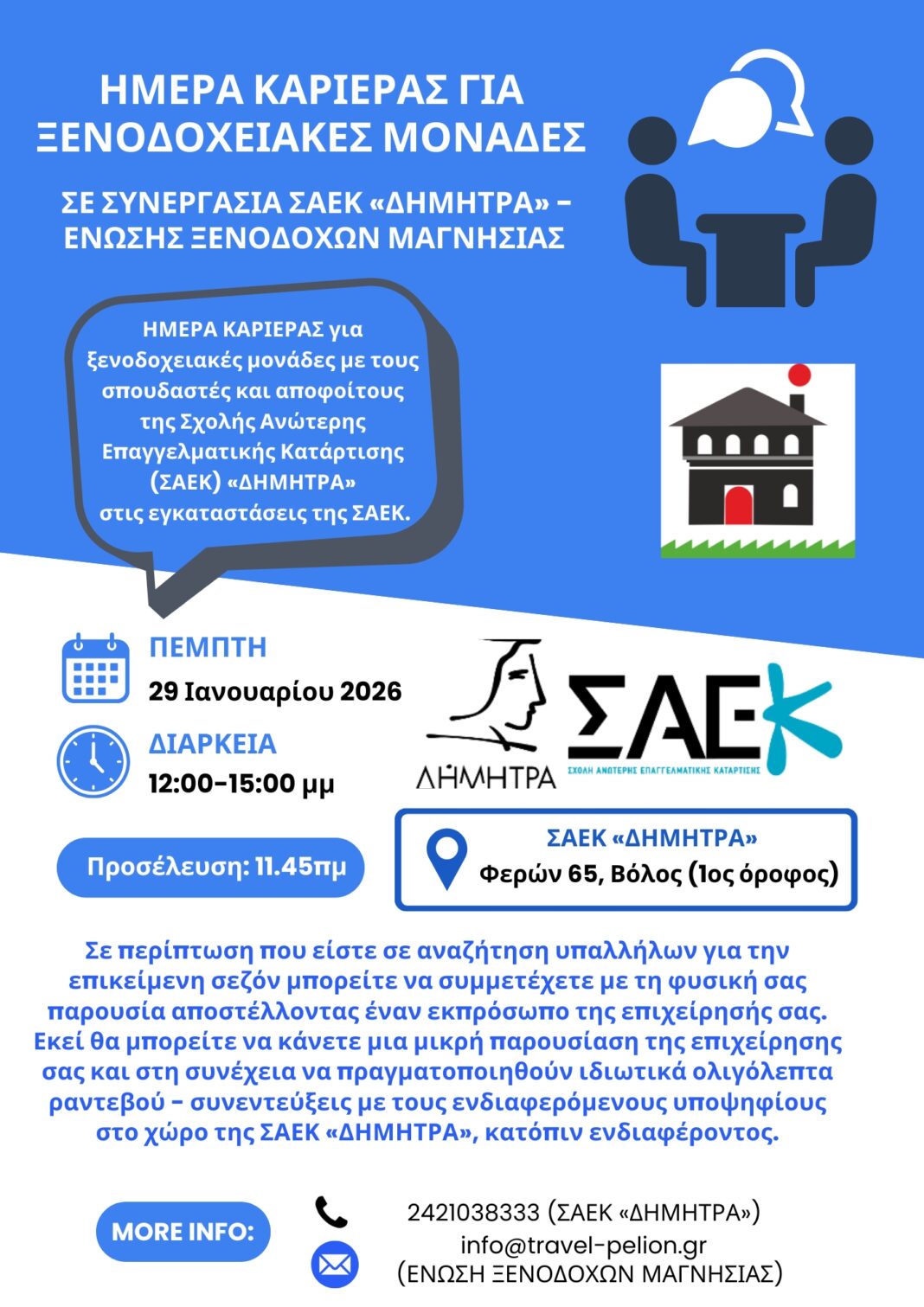 Οικονομία ΗΜΕΡΑ ΚΑΡΙΕΡΑΣ ΓΙΑ ΞΕΝΟΔΟΧΕΙΑΚΕΣ ΜΟΝΑΔΕΣ ΑΠΟ ΤΗΝ ΣΑΕΚ ΔΗΜΗΤΡΑΚΑΙ ΤΗΝ ΕΝΩΣΗ ΞΕΝΟΔΟΧΩΝ... Οικονομία ΗΜΕΡΑ ΚΑΡΙΕΡΑΣ ΓΙΑ ΞΕΝΟΔΟΧΕΙΑΚΕΣ ΜΟΝΑΔΕΣ ΑΠΟ ΤΗΝ ΣΑΕΚ ΔΗΜΗΤΡΑΚΑΙ ΤΗΝ ΕΝΩΣΗ ΞΕΝΟΔΟΧΩΝ ΜΑΓΝΗΣΙΑΣ 20 Ιανουαρίου 2026 ΠΑΡΟΜΟΙΑ ΑΡΘΡΑΠΕΡΙΣΣΟΤΕΡΑ Ο Ε.Βενιζέλος στην κοπή πίτας του Συνδέσμου βιομηχάνων στον Βόλο Σκιάθος: Η τουριστική περίοδος ξεκινά Μάρτιο! Ποια είναι η πρώτη διεθνής πτήση Με ομιλητή τον Ε.Βενιζέλο η κοπή πίτας του ΣΒΘΣΕ Πρόσφατα Άδειασαν ξενοδοχεία στη Μακρινίτσα που έμειναν χωρίς νερό μία εβδομάδα από διαρροή πετρελαίου 20 Ιανουαρίου 2026 Η ΠΠΜ στη διαβούλευση για τα νερά του Πηλίου 20 Ιανουαρίου 2026 Στολίδι το Δημοτικό Στάδιο της Σκιάθου – Παραδόθηκε το έργο 20 Ιανουαρίου 2026 Κλειστά τα σχολεία σε Μηλιές και το Γυμνάσιο Αργαλαστής 19 Ιανουαρίου 2026 Κλειστά και αύριο τα σχολεία και οι Παιδικοί Σταθμοί στο Δήμο Ζαγοράς-Μουρεσίου 19 Ιανουαρίου 2026 Πραγματοποιήθηκε το 1ο Περιφερειακό Συμβούλιο με τον νέο Περιφερειακό Έφορο Προσκόπων Μαγνησίας 19 Ιανουαρίου 2026 “Μάχη” των εκχιονιστικών να κρατήσουν ανοιχτό το οδικό δίκτυο στο Πήλιο (video) 19 Ιανουαρίου 2026 «Συμμαχία για τον Βόλο»:Παλαιός και ξεπερασμένος ο σχεδιασμόςγια το έργο μεταφοράς νερού από το Πήλιο 19 Ιανουαρίου 2026 Πρόκριση στη Χειμερινή Ολυμπιάδα της Κορτίνα 19 Ιανουαρίου 2026 Οχι Μητσοτάκη στο εμβόλιο για την ευλογιά – Επεισόδιο Μπιλλίνη με κτηνοτρόφο 19 Ιανουαρίου 2026