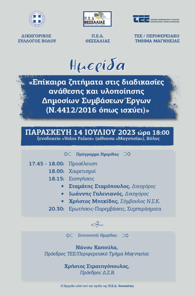 Ημερίδα με θέμα «Επίκαιρα ζητήματα στις διαδικασίες ανάθεσης και υλοποίησης Δημοσίων Συμβάσεων Έργων (Ν.4412/2016 όπως ισχύει)», συνδιοργανώνουν το ΤΕΕ Μαγνησίας, ο Δικηγορικός Σύλλογος Βόλου και η ΠΕΔ Θεσσαλίας, την Παρασκευή 14 Ιουλίου 2023, στις 6 το απόγευμα στο ξενοδοχείο «Volos Palace» (αίθουσα «Μαγνησία»).
