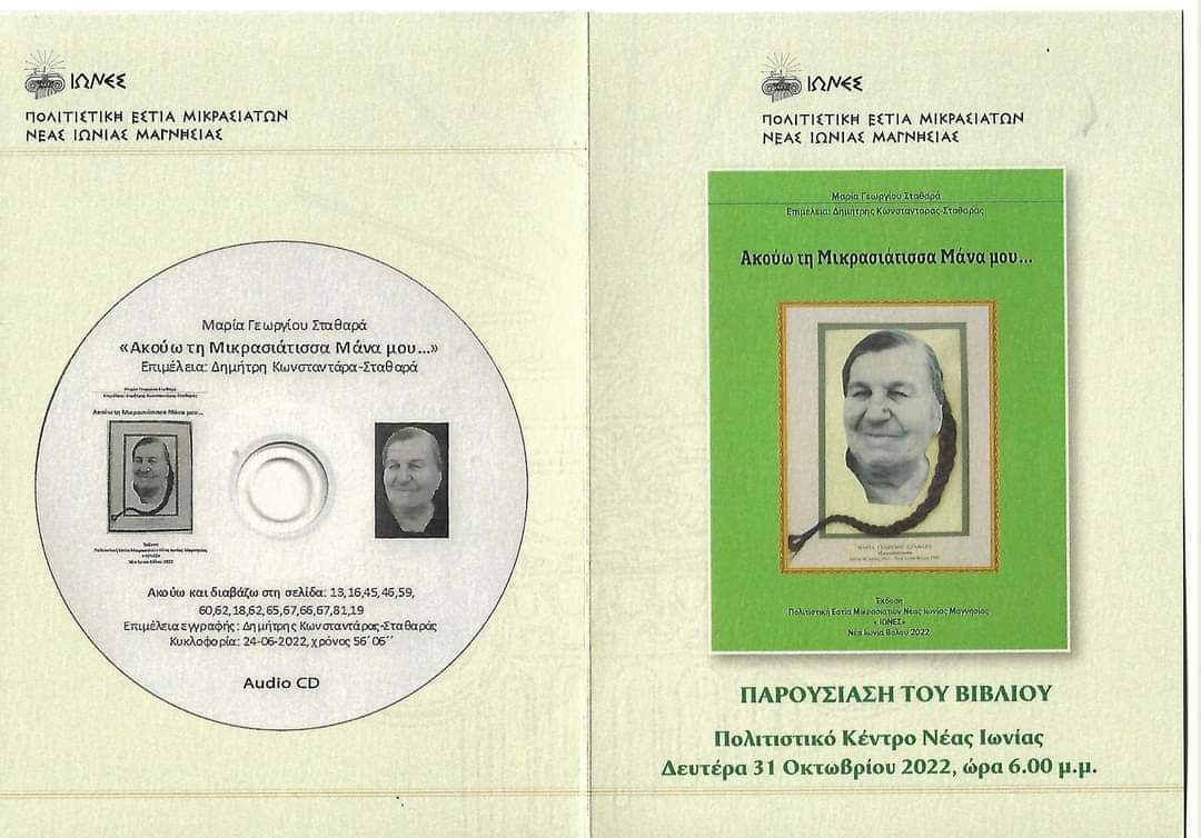 Το βιωματικό αυτό βιβλίο της Μαρίας Σταθαρά «Ακούω τη Μικρασιάτισσα Μάνα μου…», που εξέδωσαν οι «ΙΩΝΕΣ», έρχεται στην επέτειο των 100 χρόνων από τη Μικρασιατική Καταστροφή να δώσει στους αναγνώστες μια «ζωντανή» μαρτυρία από τα «οικεία πάθη» της εποχής εκείνης με τον πανικό της φυγής, την προσφυγιά και την εγκατάσταση των προσφύγων στη νέα τους πατρίδα, εδώ στον προσφυγικό συνοικισμότης Νέας Ιωνίας Βόλου.