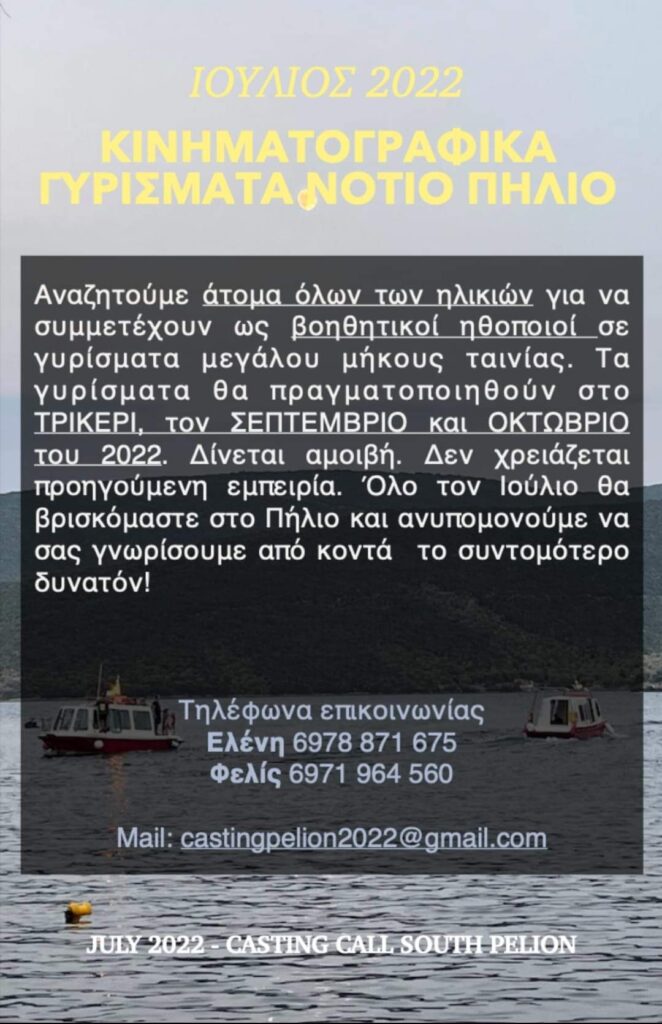 Κάστινγκ για κομπάρσους που θα συμμετάσχουν σε ισπανική ταινία Οσκαρικού σκηνοθέτη, αναζητεί στη Μαγνησία εταιρεία παραγωγής. Η ταινία θα γυριστεί στο Νότιο Πήλιο και συγκεκριμένα στον παραθαλάσσιο οικισμό Κότες, στην Αγία Κυριακή και το Τρίκερι. Πρόκειται για μια ρομαντική ιστορία με σύγκρουση χαρακτήρων που θα εκτυλιχθεί με επίκεντρο γνωστή ψαροταβέρνα στις Κότες. Τα γυρίσματα θα ξεκινήσουν τον ερχόμενο Σεπτέμβριο και η εταιρεία έχει αναρτήσει αγγελία αναζητώντας κομπάρσους. Όσοι επιθυμούν μπορούν να επικοινωνήσουν στα τηλέφωνα 6978 871675 και 6971 964560 (κ. Ελένη). Θα τους ζητηθεί να στείλουν με email δυο φωτογραφίες τους προκειμένου να γίνει η επιλογή.
