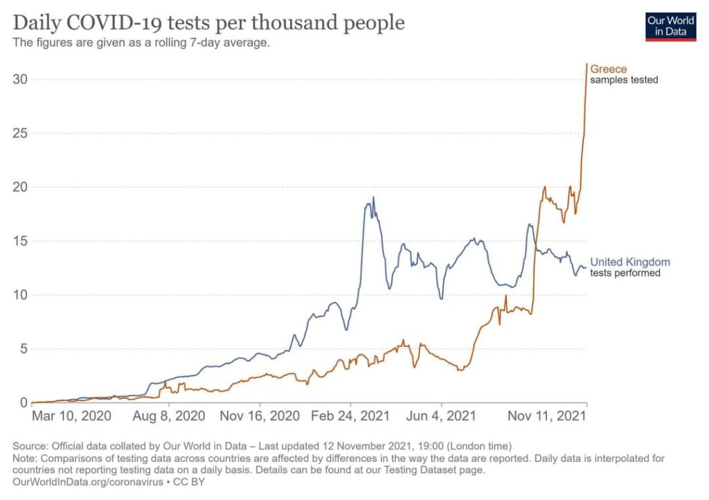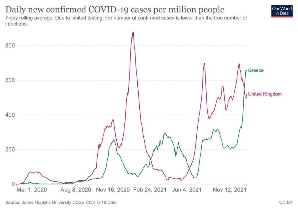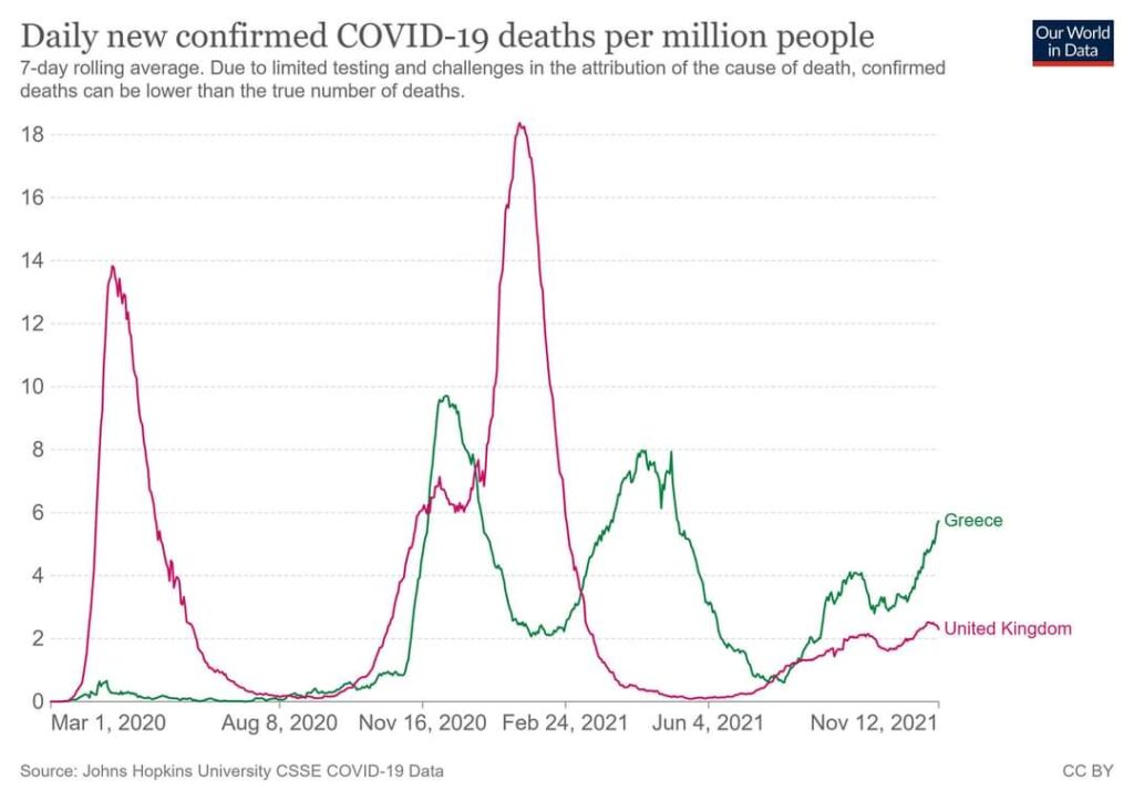 Συμπερασματικά ας σταματήσουμε να συζητάμε συνέχεια για “κρούσματα” και ας δούμε την πραγματική εικόνα της πανδημίας που είναι οι θάνατοι, καθημερινά . Στην πατρίδα μας ενώ αντιμετωπίσαμε μικρότερα πανδημικά κύματα από την Αγγλία , δεν μπορέσαμε να διορθώσουμε τις χρόνιες αδυναμίες του συστήματος υγείας , και τελικά επιλέξαμε παρότι είχαμε διαθεσιμότητα εμβολίων, την άσκοπη “βίαια” δια της νόσου, ανοσοποίηση.