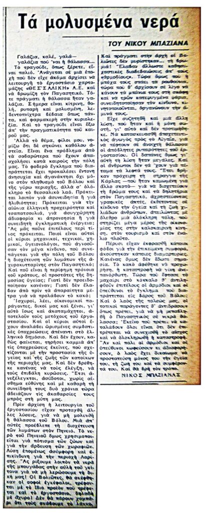 Είναι χαρακτηριστικό ότι τα φύλλα των τοπικών εφημερίδων της 21ης Απριλίου δεν πρόλαβαν την εκδήλωση του πραξικοπήματος και πρόταξαν τη μεγάλη συγκέντρωση κατά της μόλυνσης του Παγασητικού από το εργοστάσιο χαρτομάζας (στην πρώτη φωτογραφία, το πρωτοσέλιδο ρεπορτάζ της «Θεσσαλίας» -21.4.1967- για τη συγκέντρωση. Οι άλλες δύο φωτογραφίες είναι από το πρωτοσέλιδο του «Ταχυδρόμου» της προηγούμενης μέρας -20.4.1967: απ΄ τη μια, ο χάρτης με τον σκωπτικό τίτλο, κι απ’ την άλλη, το αιχμηρό άρθρο του αλησμόνητου φιλόλογου καθηγητή μας και ξεχωριστού πνευματικού ανθρώπου, Νίκου Μπαζιάνα, που δεν μασάει τα λόγια του: «ισχυροί οικονομικοί παράγοντες, δικοί μας και ξένοι, γι’ αυτό ίσως και ακαταμάχητοι, αποτελούν τους μετόχους του εργοστασίου» ‒ είπαμε: η Ιστορία μπορεί να μην επαναλαμβάνεται, συχνά όμως ομοιοκαταληκτεί…).