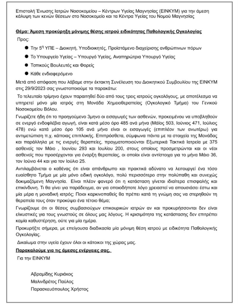 Κατέθεσαν ΑΝΑΦΟΡΑ την Επιστολή της Ένωσης Ιατρών Νοσοκομείου – Κέντρων Υγείας Μαγνησίας (ΕΙΝΚΥΜ), στην οποία ζητούν να στελεχωθεί η Μονάδα Χημειοθεραπείας (Ογκολογικό Τμήμα) του Γενικού Νοσοκομείου Βόλου.