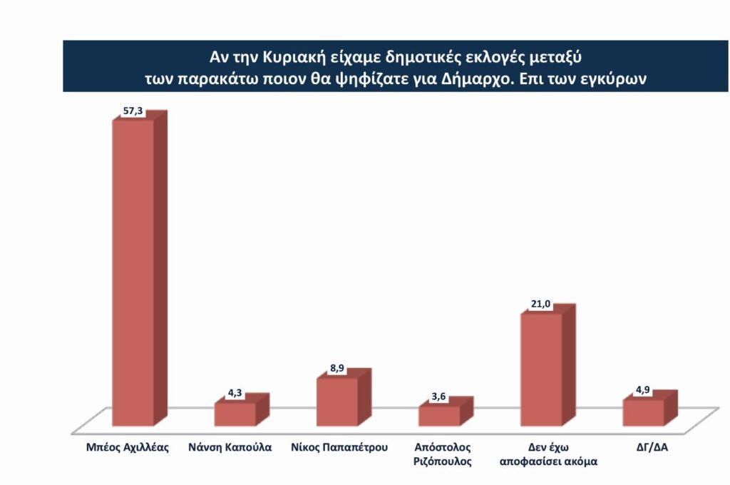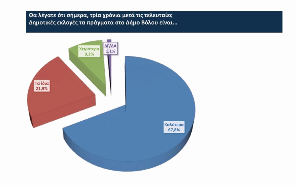Οι αναποφάσιστοι καταγράφονται στο 21% και εκείνοι που δεν ξέρουν ή δεν απαντούν στο 4,9%, ενώ στην ερώτηση εάν τα πράγματα στην πόλη είναι καλύτερα σε σχέση με τις τελευταίες εκλογές το 67,8% απαντά καλύτερα.