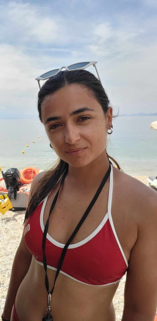 Αντιλαμβανόμενη ότι δεν μπορούν να επανέλθουν και έχοντας περάσει τα όρια οριοθέτησης της παραλίας πήρε το σωσίβιο διάσωσης και βούτηξε για να τα βοηθήσει.