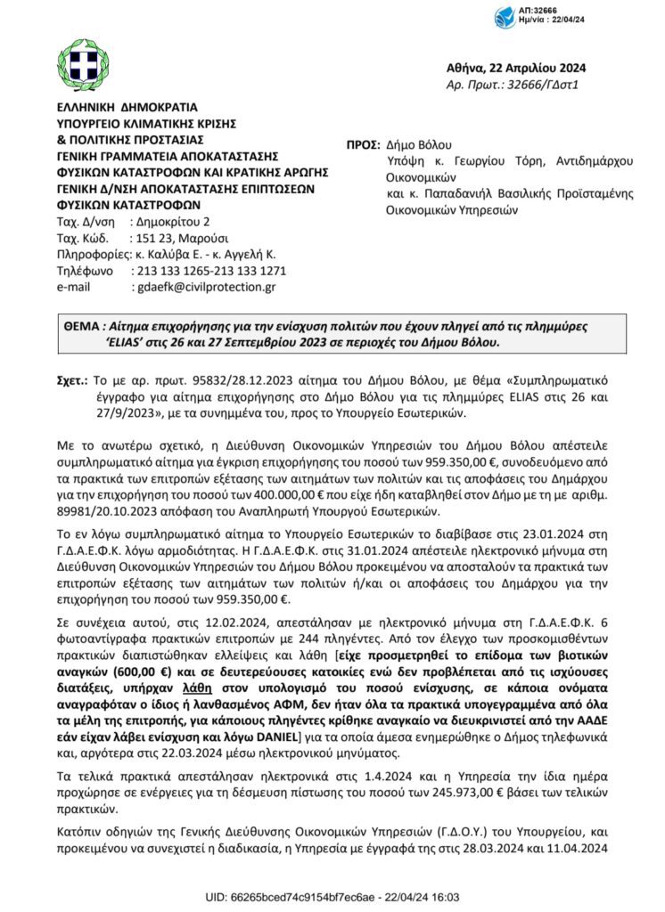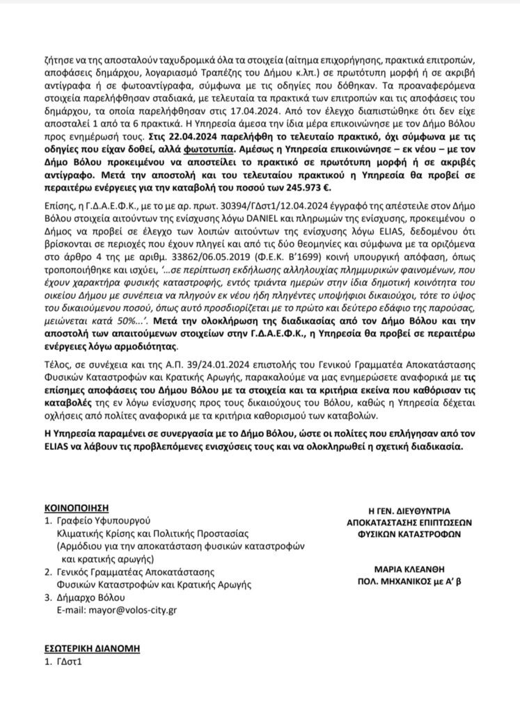 Ο δήμος Βόλου κατέθεσε στις 28 Δεκέμβρη του 2023 – τρεις μήνες μετά- συμπληρωματικό αίτημα για επιπλέον κρατική επιχορήγηση για την ενίσχυση των πληγέντων. Μετά από ένα μήνα, στις 31 Γενάρη του 2024, η Γενική Διεύθυνση Αποκατάστασης Επιπτώσεων Φυσικών Καταστροφών (Γ.Δ.Α.Ε.Φ.Κ) ζητά από τον Δήμο Βόλου τα απαραίτητα έγγραφα, τα οποία η δημοτική αρχή στέλνει ενάμιση μήνα αργότερα, στις 12 Φλεβάρη του 2024!