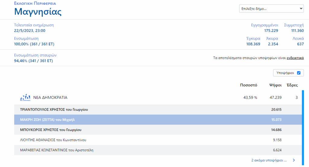 Είκοσι Εκλογικά Τμήματα σύμφωνα με την επίσημη σελιδα του Υπουργείου Εσωτερικών δεν έχουν ακόμη προσμετρηθεί σε επίπεδο σταυροδοσίας στο τελικό αποτέλεσμα της Μαγνησίας των εκλογών της περασμένης Κυριακής. Κατά πληροφορίες μεταξύ αυτών λείπουν δέκα Ε.Τ στον Βόλο και δύο στον Αλμυρό, τμήματα τα οποία πιθανως θα μπορούσαν να προκαλέσουν ανακατατάξεις στη σειρά ων υποψηφίων.