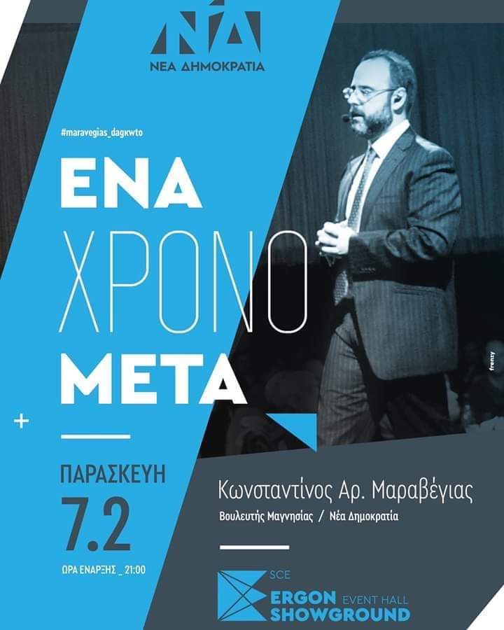 Σε ανοιχτή εκδήλωση αποτίμησης και αξιολόγησης, ένα χρόνο μετά την πρώτη του πολιτική παρουσία στο ERGON στου Τσαλαπάτα, καλεί στον ίδιο χώρο τους πολίτες του νομού την Παρασκευή 7/2 στις 21:00 ο βουλευτής της ΝΔ Κώστας Μαραβέγιας. Ο γιατρός συνεπής ως προς την λογοδοσία του προς τους πολίτες για την δραστηριότητα του, θα παρουσιάσει τα πεπραγμένα και τις θέσεις του στο πλαίσιο του κυβερνητικού έργου της ΝΔ.