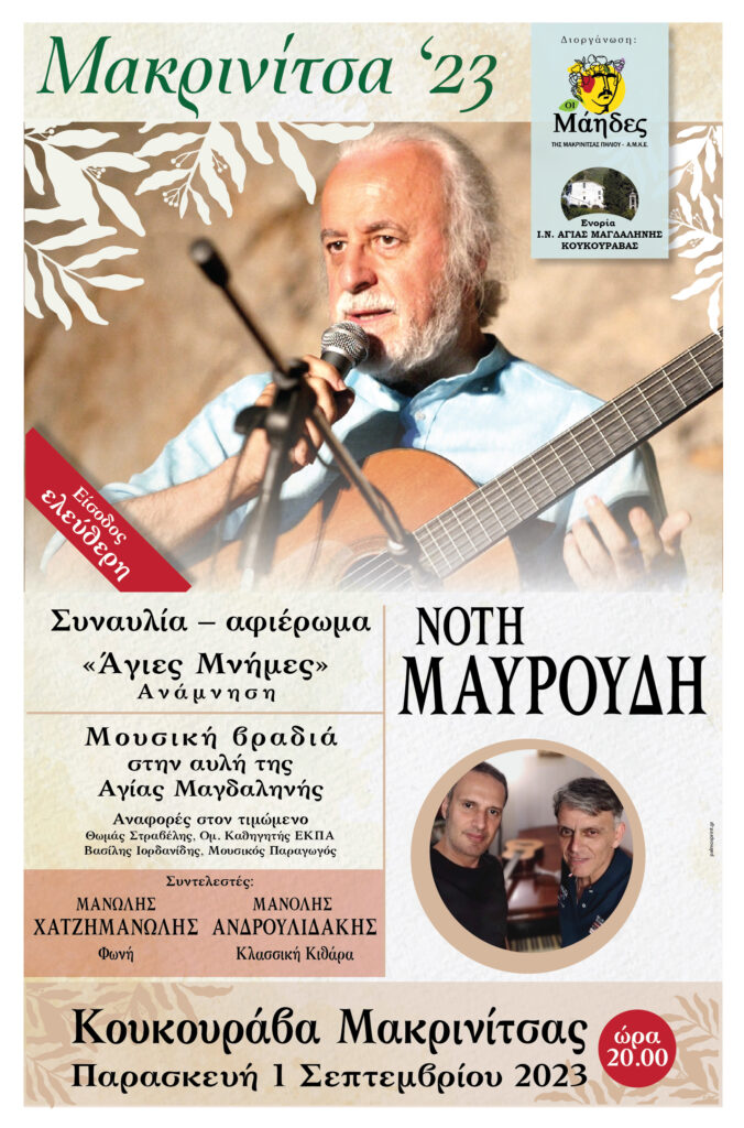 Θα ακουστούν συνθέσεις του τιμώμενου Καλλιτέχνη, ερμηνευμένες από τον Μανώλη Χατζημανώλη και τον Μανόλη Ανδρουλιδάκη στην κιθάρα, (μαθητής του Νότη Μαυρουδή στην κιθάρα), στην αυλή της αγαπημένης του Αγίας Μαγδαληνής της Κουκουράβας, την προσεχή Παρασκευή 1 Σεπτεμβρίου 2023.