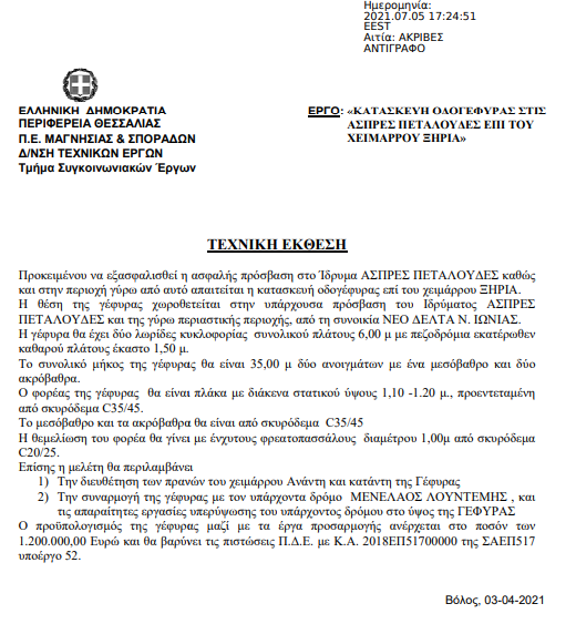 Αναφέρομαι στη «ΚΑΤΑΣΚΕΥΗ ΟΔΟΓΕΦΥΡΑΣ ΣΤΙΣ ΑΣΠΡΕΣ ΠΕΤΑΛΟΥΔΕΣ ΕΠΙ ΤΟΥ ΧΕΙΜΑΡΡΟΥ ΞΗΡΙΑ». (προϋπολογισμού 1,200,000 ευρώ)