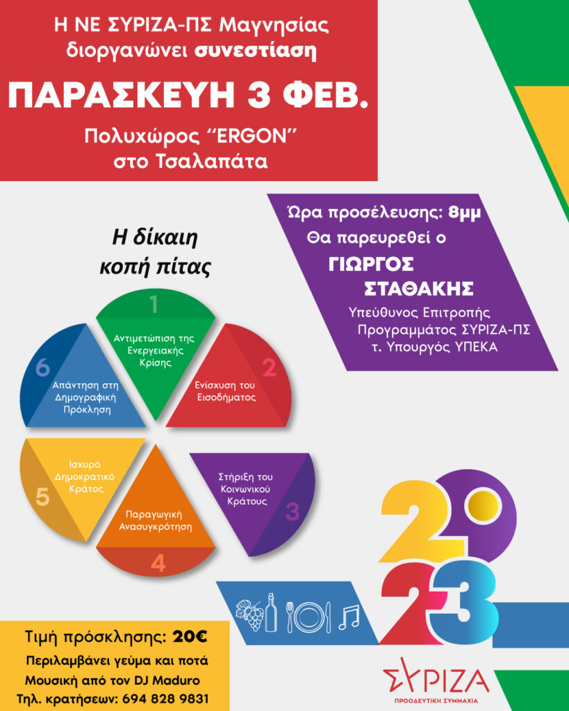 Η ΝΕ ΣΥΡΙΖΑ-ΠΣ Μαγνησίας πραγματοποιεί συνεστίαση-κοπή πίτας την Παρασκευή 3 Φεβρουαρίου στις 20.00 στο ERGON που βρίσκεται στον πολυχώρο Τσαλαπάτα.