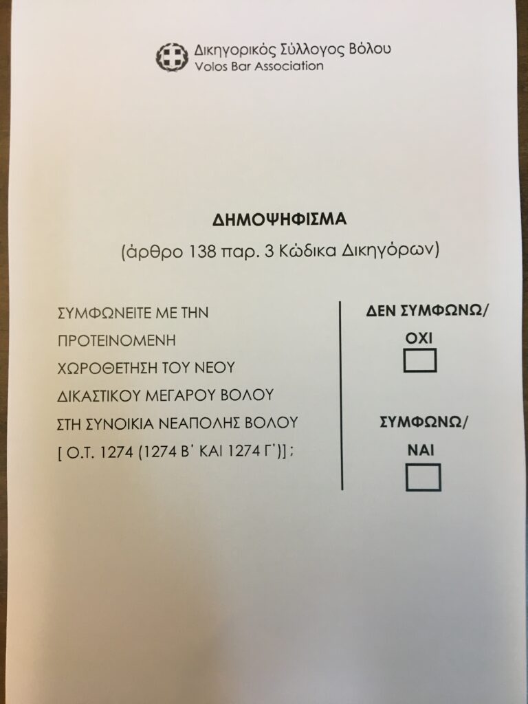 Το δημοψήφισμα που γίνεται με αρνητική εισήγηση του Δ.Σ του Συλλόγου για τη χωροθέτηση του νέου δικαστικού μεγάρου στο οικόπεδο της οδού Ύδρας, αύριο Σάββατο θα συνεχιστεί από 9 π.μ. έως 5 μ.μ., στην ισόγεια αίθουσα συνεδριάσεων του Πρωτοδικείου Βόλου .