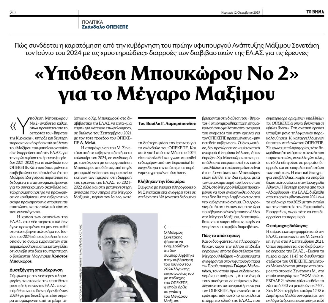 Σύμφωνα με την εφημερίδα, και ο Μάξιμος Σενετάκης φαίνεται πως απομακρύνθηκε από τη θέση του ως υφυπουργός Ανάπτυξης, καθώς καταγράφεται και αυτός στο διαβιβαστικό της ΕΛ.ΑΣ. να ζητά χάρη για κάποιον επωφελούμενο από τον τότε πρόεδρο του ΟΠΕΚΕΠΕ, Δημήτρη Μελά.