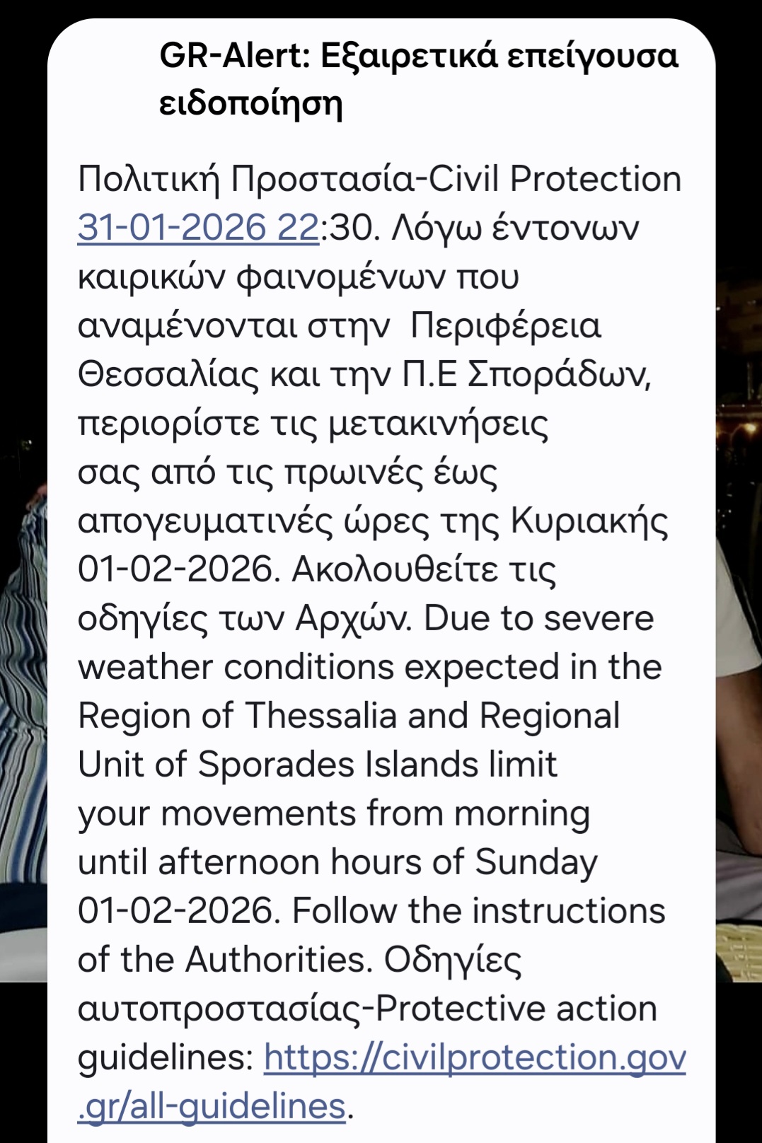 Μήνυμα απο το 112 στα τηλέφωνα των πολιτών της Μαγνησίας εφτασε στις 10:30 σημερα το βράδυ για την κακοκαιρία που έρχεται απο τις πρωινές ώρες μέχρι κύριο χαρακτηριστικό τις ισχυρές βροχές και καταιγίδες. Οι πολιτες καλούνται να μην κάνουν άσκοπες μετακινήσεις