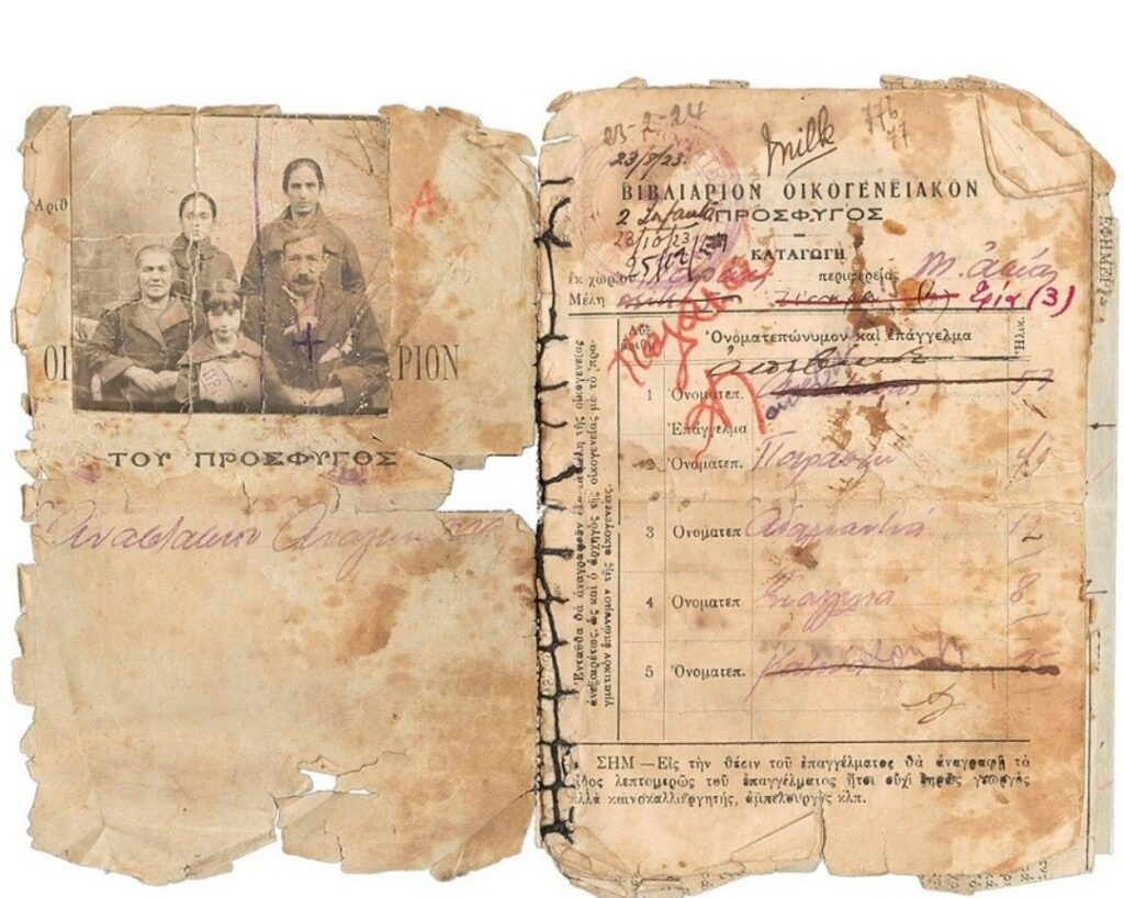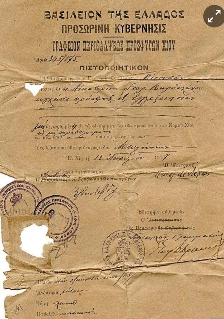 Οικογενειακό βιβλιάριο πρόσφυγος, 1923 (συλλογή Πολιτιστικής Εστίας Μικρασιατών Νέας Ιωνίας Μαγνησίας «ΙΩΝΕΣ»).Πιστοποιητικό Γραφείου Περιθάλψεως Προσφύγων Χίου Αικατερίνης Βαρδαλάχου, 1917 (συλλογή Πολιτιστικού Συλλόγου Μικρασιατών Μαγνησίας «Το Εγγλεζονήσι»).Από την περιοχή της Μαγνησίας (Χαμιντιέ) της Μ. Ασίας, ο Παναγιώτης Χατζηπέτρου και η Ειρήνη Χατζηγιαννακού με την κόρη τους Γραμματική, 1926 (συλλογή Ειρήνης Βουγιούκα).Οικογενειακή φωτογραφία Αγλαΐα Δημόγλου (στο μέσον) και Αριάδνη (Εριέττα) Δημόγλου, περί το 1930 (συλλογή Βαγγέλη Δημόγλου).
