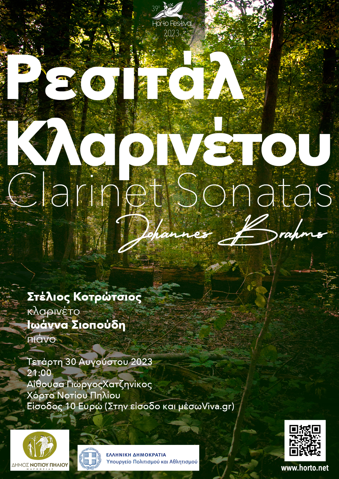 Τετάρτη 30 Αυγούστου, 21:00Ρεσιτάλ για κλαρινέτο και πιάνοΑίθουσα Γιώργος ΧατζηνίκοςΟι σονάτες του Γιοχάνες ΜπράμςΕίσοδος: 10€ και μέσω https://www.more.com/music/resital-klarinetou-kai-pianou/