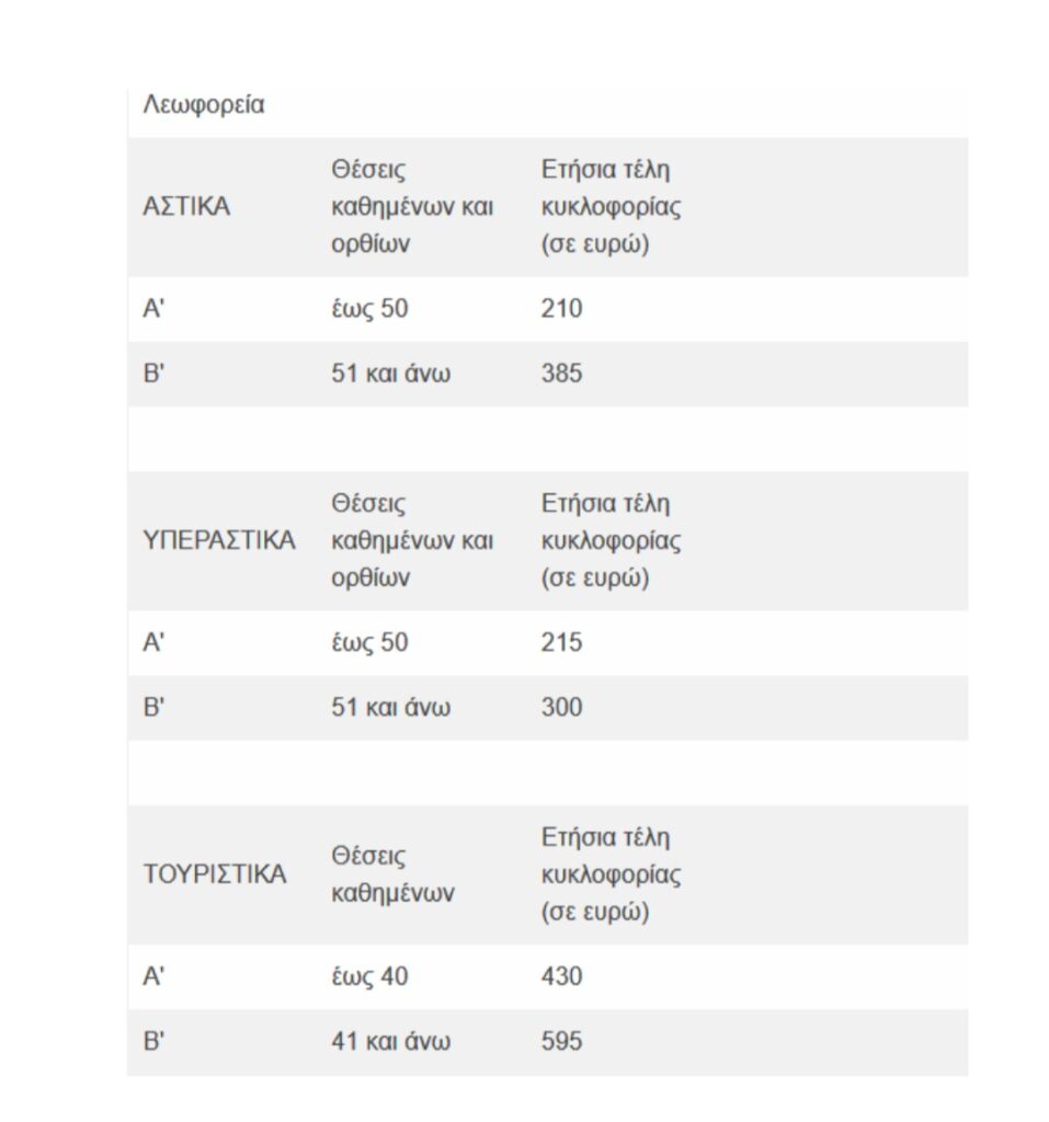 Επισυνάπτουμε πίνακα με τα τέλη κυκλοφορίας για κάθε κατηγορία λεωφορείου, για του