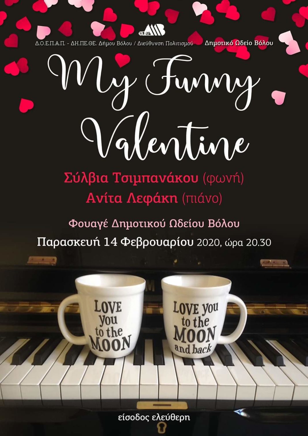 Η Διεύθυνση Πολιτισμού του ΔΟΕΠΑΠ – ΔΗΠΕΘΕ και το Δημοτικό Ωδείο Βόλου μας προσκαλούν την Παρασκευή 14 Φεβρουαρίου 2020 στις 8:30 μ.μ στο φουαγιέ του Δημοτικού Ωδείου Βόλου σε μία ιδιαίτερη συναυλία αφιερωμένη στον έρωτα. Η υψίφωνος και καθηγήτρια μονωδίας του Δημοτικού Ωδείου Βόλου Σύλβια Τσιμπανάκου θα μας ταξιδέψει με τη φωνή της με ένα μοναδικό τρόπο και μέσα από ένα ποικίλο και μαγευτικό πρόγραμμα. Μαζί της στο πιάνο η καθηγήτρια του Δημοτικού Ωδείου Ανίτα Λεφάκη. Η είσοδος είναι ελεύθερη.