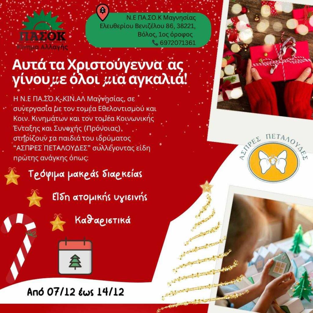 Η Νομαρχιακή Επιτροπή Μαγνησίας του ΠΑΣΟΚ – Κινήματος Αλλαγής σε συνεργασία με τον Τομέα Εθελοντισμού και Κοινωνικών Κινημάτων και τον Τομέα Κοινωνικής Ένταξης και Συνοχής (Πρόνοιας) στηρίζουν τα παιδιά του ιδρύματος “Άσπρες Πεταλούδες” συλλέγοντας είδη πρώτης ανάγκης όπως: