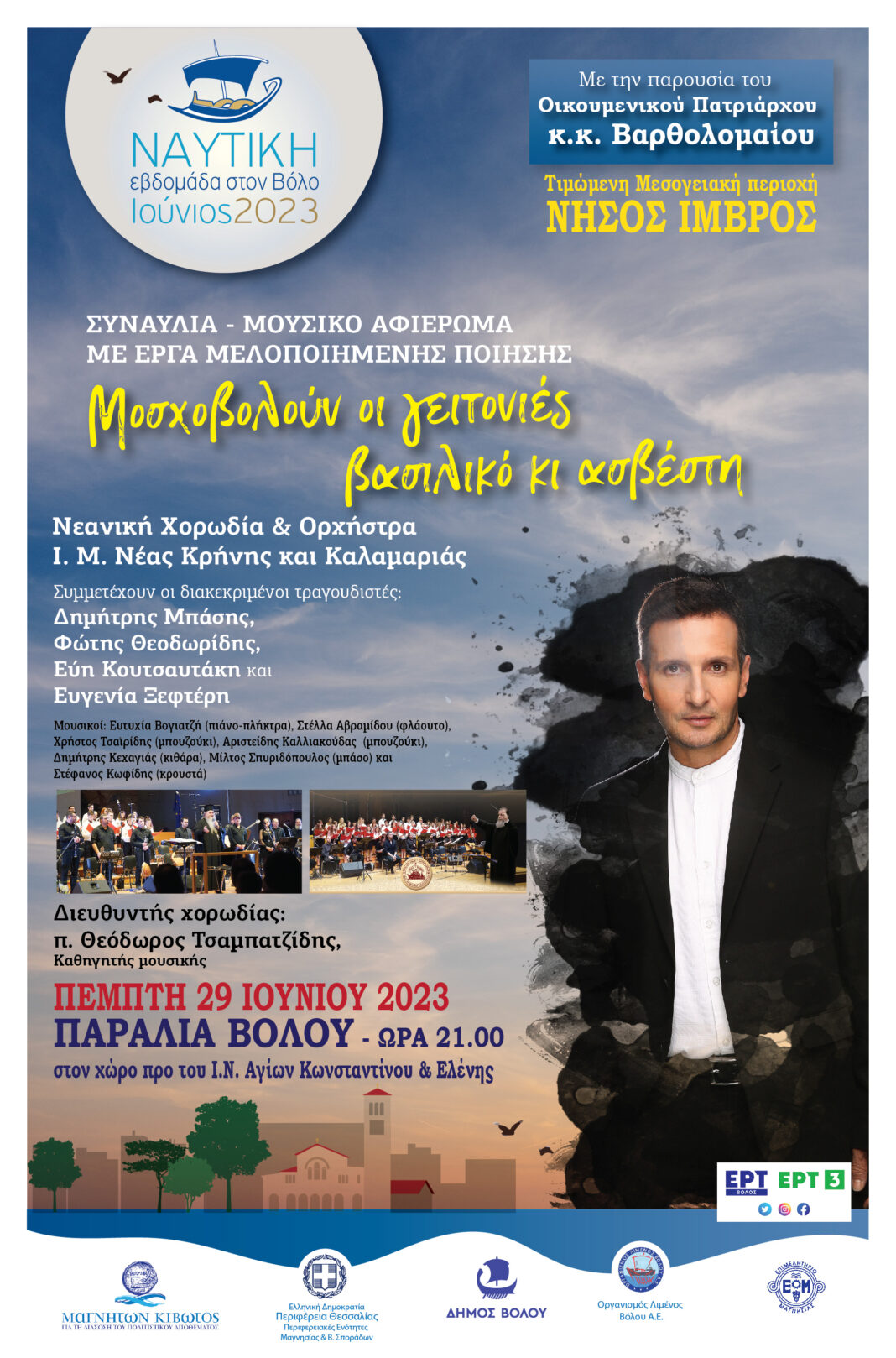 Σήμερα Πέμπτη 29 Ιουνίου 2023, την ίδια πάντα ώρα, ώρα 21.00, στην Παραλία του Βόλου, στον χώρο έμπροσθεν Ιερού Ναού Αγίων Κωνσταντίνου και Ελένης, ο Δημήτρης Μπάσης θα είναι και πάλι στον Βόλο με την Νεανική Χορωδία και Ορχήστρα της Ιεράς Μητροπόλεως Νέας Κρήνης και Καλαμαριάς.