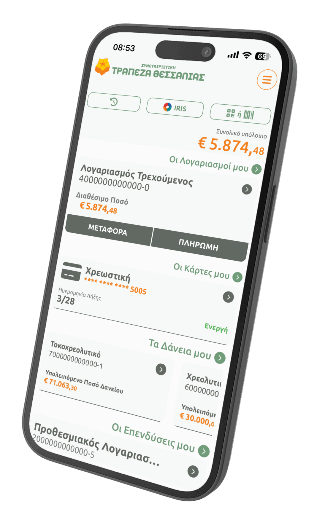 H εφαρμογή ThessalyBank παρέχει γρήγορη και ασφαλή πρόσβαση μέσω 4ψήφιου PIN ή βιομετρικών στοιχείων της συσκευής. Στην αρχική σελίδα οι πελάτες έχουν ολοκληρωμένη εικόνα των λογαριασμών, των δανείων, των καρτών και των προθεσμιακών καταθέσεών , ενώ μπορούν να πραγματοποιούν άμεσες συναλλαγές, όπως πληρωμές και μεταφορές κεφαλαίου, χρησιμοποιώντας παράλληλα QR Code ή Barcode για γρήγορη πληρωμή λογαριασμών.