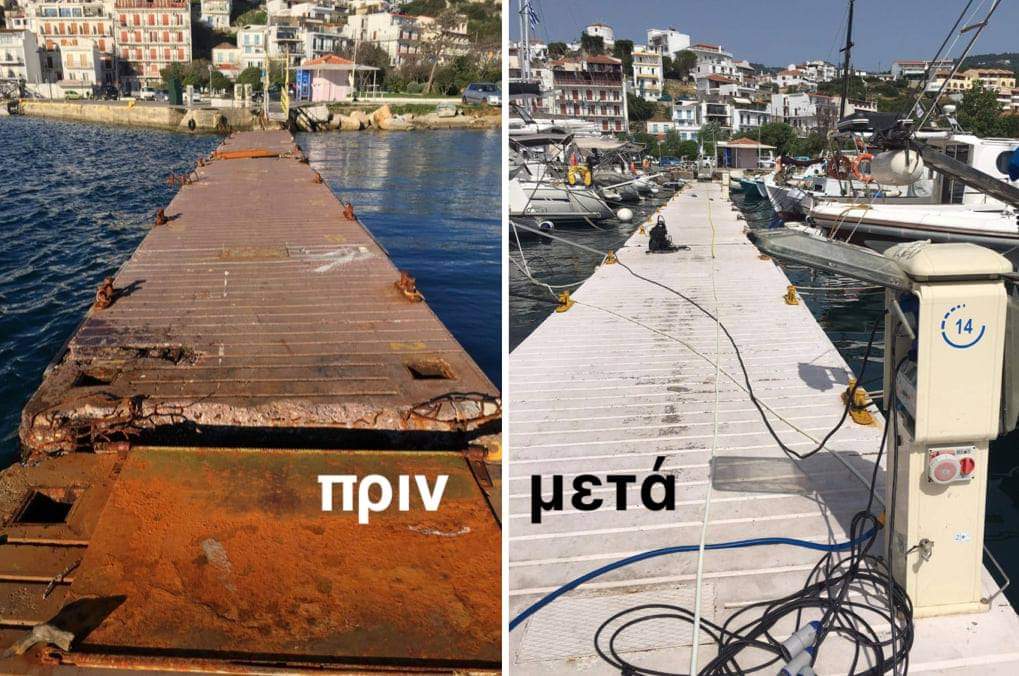 δόθηκε η άδεια για την τοποθέτηση, εντός του χωροθετημένου Τουριστικού Λιμένα Σκιάθου, πλωτής εξέδρας για την προσωρινή πρόσδεση σκαφών. Η άδεια δόθηκε κατ’ εξαίρεση μετά τις ρητές δεσμεύσεις του Δημάρχου Σκιάθου για τον επανασχεδιασμό της μαρίνας. Με ενέργειες του Δημοτικού Λιμενικού Ταμείου (Δ.Λ.Τ.), έγιναν εργασίες επισκευής στις πλωτές εξέδρες που είχε εξασφαλίσει με δωρεάν παραχώρηση το Δ.Λ.Τ. από την Εταιρεία Ακινήτων του Δημοσίου (ΕΤΑΔ), το 2020. Στην πλωτή τοποθετήθηκαν για πρώτη φορά, pillars για παροχή νερού και ηλεκτρικού ρεύματος, οι πλωτές συνδέθηκαν με τον τρόπο που προέβλεπε ο κατασκευαστής ώστε να είναι ασφαλείς.