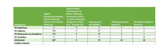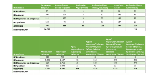 Είναι σαφές από τους πρώτους μήνες χρήσης της υπηρεσίας του ΚΩΔΙΚΟΥ RF και της δυνατότητας ψηφιακής εξυπηρέτησης μέσω του GOV.gr που υπήρξε, πως μειώθηκαν σημαντικά οι μετακινήσεις και ο συνωστισμός των πολιτών στις Διευθύνσεις Μεταφορών της Περιφέρειας Θεσσαλίας, ενώ μειώθηκε σημαντικά η ταλαιπωρία και το κόστος μετακίνησης για πολίτες απομακρυσμένων ορεινών και νησιωτικών περιοχών στα διοικητικά όρια της Θεσσαλίας. Τα αναλυτικά στοιχεία του πρώτου τετραμήνου εφαρμογής της μεταρρύθμισης που συντελεσθεί παρουσιάζονται ανάγλυφα στους παρακάτω πίνακες, ενώ πρέπει να σημειωθεί ότι μειώθηκε και ο όγκος των έγχαρτων φακέλων που στοιβάζονται επί χρόνια στους γεμάτους χώρους αρχείων των Διευθύνσεων Μεταφορών σε Λάρισα Βόλο, Τρίκαλα και Καρδίτσα.
