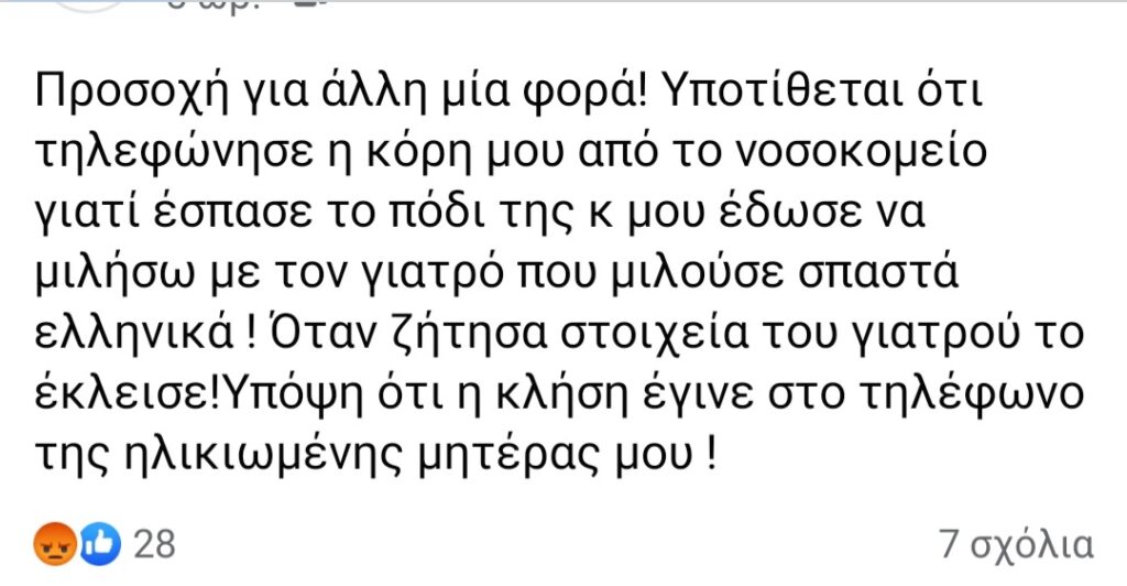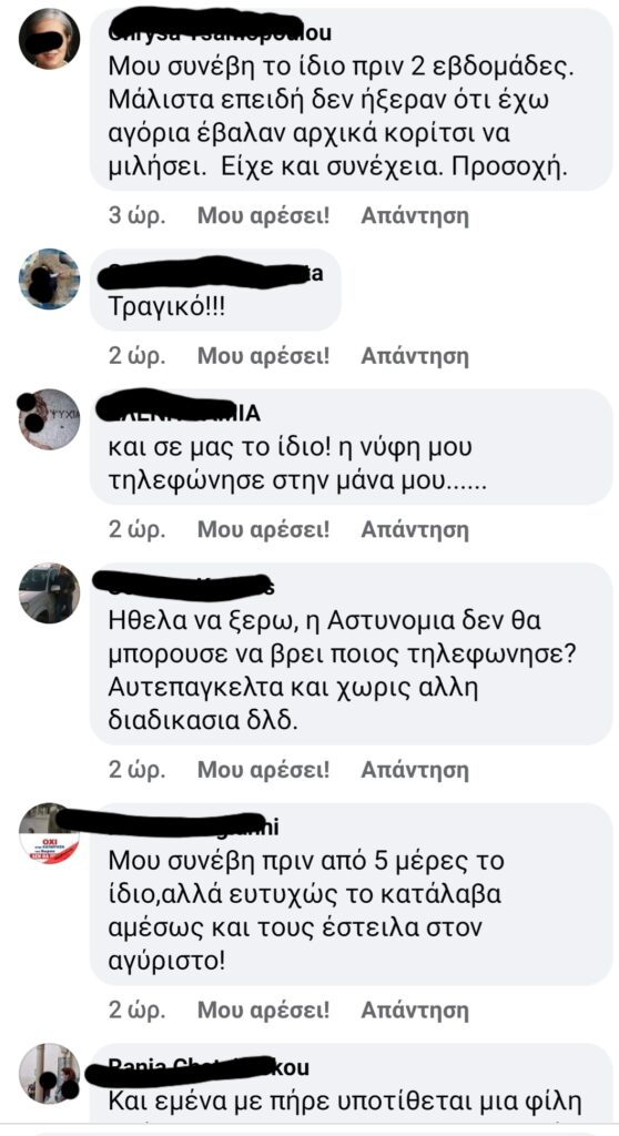 Τις εμπειρίες τους με τους απατεώνες που τηλεφωνουν στα σπίτια τους και τους λένε πως χτύπησαν σε ατύχημα συγγενικα τους πρόσωπα μοιράζονται στα ΜΚΔ οι πολίτες του Βόλου, ενημερώνοντας ο ένας τον άλλο για τους απατεώνες που συνεχίζουν την εγκληματικη τους δράση.