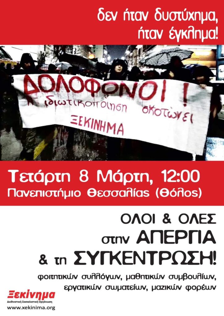 Στις 12.30 θα γίνει συγκέντρωση στην πλατεία Αγ. Νικολάου, ενώ στις 12 έχει προγραμματιστεί συγκέντρωση φοιτητών και μαθητών, στην οποία θα συμμετέχουν και άλλοι φορείς και σωματεία, στο Πανεπιστήμιο Θεσσαλίας, ενώ θα ακολουθήσει πορεία.