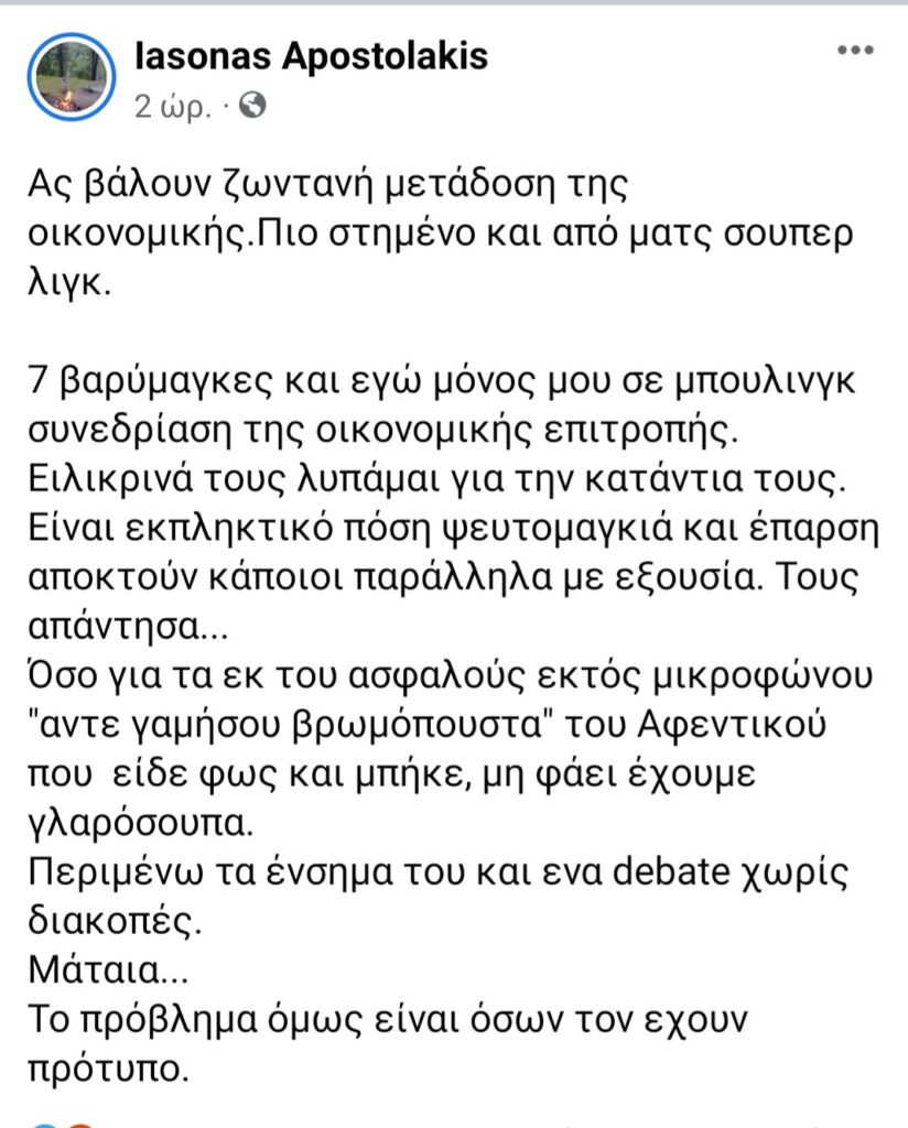Σε ανάρτησή του ο Ιασονας Αποστολάκης αποκάλυψε πως νωρίτερα το μεσημέρι για μία ακόμη φορά υπήρξε εκτός μικροφώνου θύμα ύβρεων και οχετού του Δημάρχου Βόλου και συνεργατών του κατά την διάρκεια της συνεδρίασης της Οικονομικής Επιτροπής του Δήμου. Ο κ. Μπέος σύμφωνα με τον κ. Αποστολάκη εισερχόμενος στη συνεδρίαση και ενώ υπήρχε ένταση του κ. Αποστολάκη με τον κ.Βλιώρα, απευθυνόμενος στον πρώτο με το γνωστό από άλλες δημόσιες στιγμές του ύφος θαμώνα καταγωγίων, φέρεται να του είπε: “Αντε γ@@@@@υ βρωμόπ@@@@α”. Δείτε την ανάρτηση: