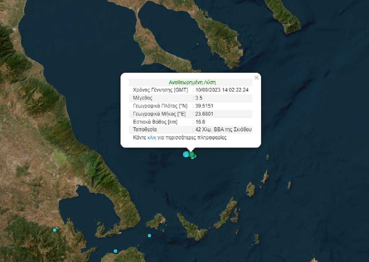 Σεισμός σημειώθηκε το απόγευμα της Πέμπτης (10/8) στη θαλάσσια περιοχή των Σποράδων, στην ίδια περιοχή που έγινε νωρίτερα ο σεισμός στην Αλόννησο.