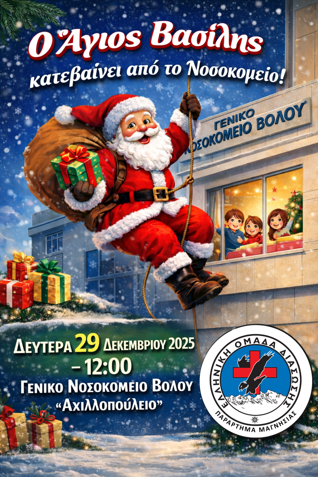 Την Δευτέρα 29 Δεκεμβρίου 2025 και ώρα 12:00, η Ελληνική Ομάδα Διάσωσης Μαγνησίας θα πραγματοποιήσει μια ξεχωριστή εορταστική εκδήλωση στο Γενικό Νοσοκομείο Βόλου, με στόχο να χαρίσει χαμόγελα και χαρά στα παιδιά που νοσηλεύονται.