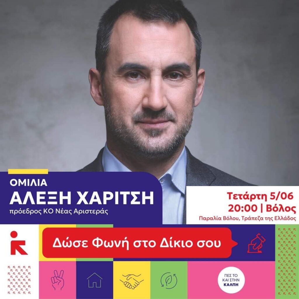 Την Τετάρτη 5 Ιουνίου στις 20:00, ο πρόεδρος της ΚΟ της Νέας Αριστεράς Αλέξης Χαρίτσης θα πραγματοποιήσει ομιλία στην παραλία του Βόλου, μπροστά από την Τράπεζα της Ελλάδος.