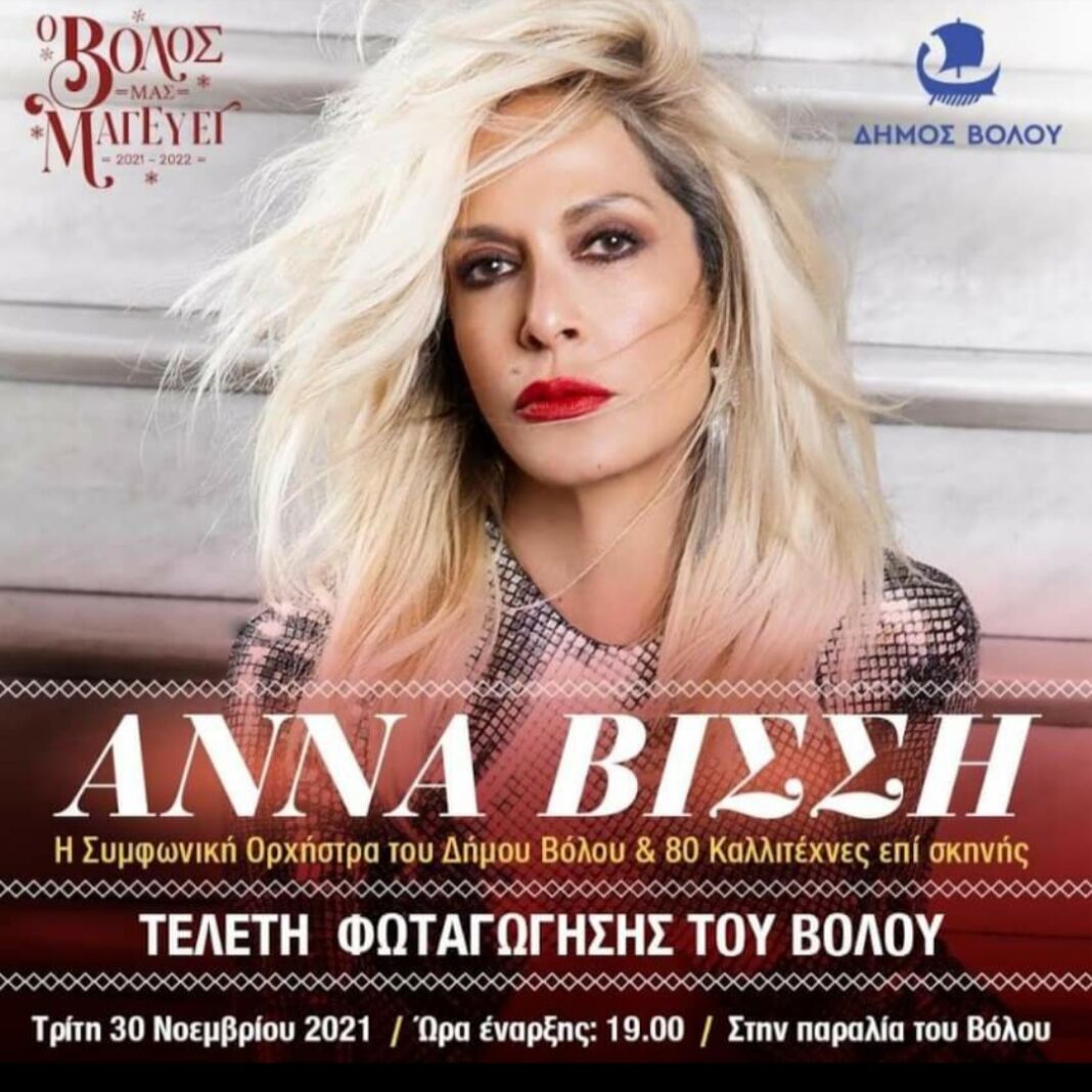 Το καλλιτεχνικό πρόγραμμα της Τελετής Φωταγώγησης αποτελείται από γιορτινές μελωδίες και κομμάτια από το ρεπερτόριο των μιούζικαλ που παρακολουθεί το κοινό την περίοδο των Χριστουγέννων, τα οποία διανθίζονται με χορογραφίες Σχολών Χορού του Βόλου, έως τη στιγμή που η Άννα Βίσση θα ανέβει στην σκηνή για να ερμηνεύσει μεγάλες της επιτυχίες και στη συνέχεια με το Δήμαρχο της πόλης κ. Αχιλλέα Μπέο να πατήσουν το «μαγικό κουμπί» για να φωταγωγηθεί η πόλη και να στολιστεί ο ουρανός με εντυπωσιακά πυροτεχνήματα.