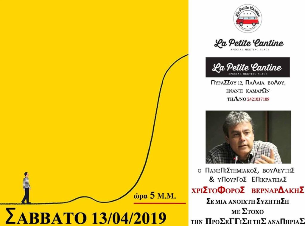 Νωτίτερα ο κ. Βερναδάκης θα μετάσχει σε εκδήλωση για θέματα αναπηρίας που θα πραγματοποιηθεί στο La petite cantine.