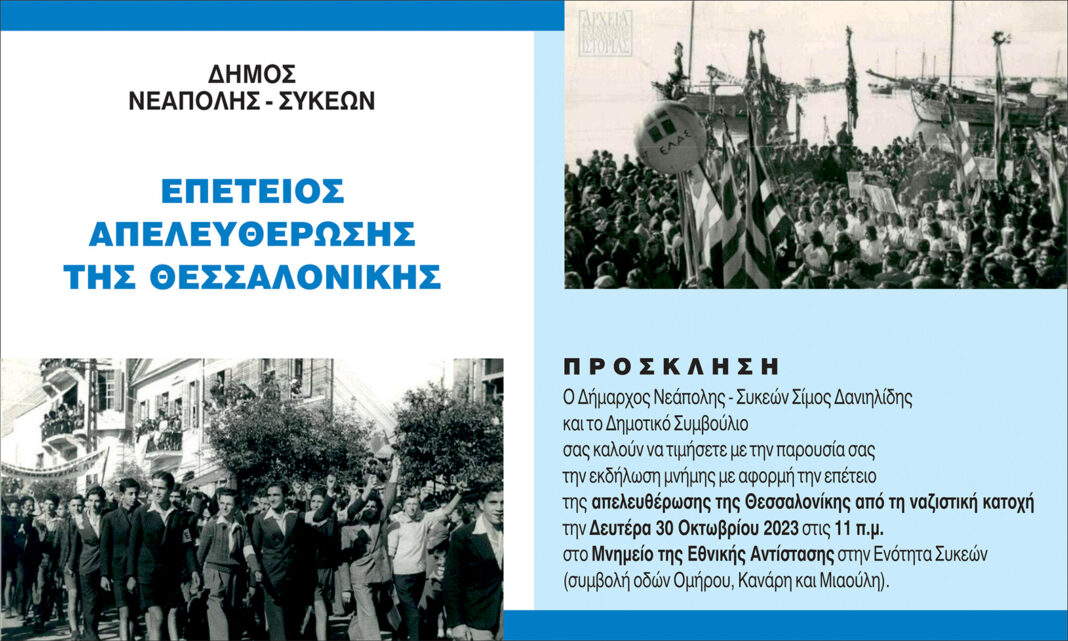 Την επέτειο απελευθέρωσης της Θεσσαλονίκης από τους Ναζί κατακτητές τιμά και φέτος ο δήμος Νεάπολης-Συκεών. Σε συνέχεια των πανηγυρικών εορτασμών του τριημέρου που αρχίζουν αύριο στις 5.30 μμ με τη λιτάνευση της εικόνας του πολιούχου Αγίου Δημητρίου Ροδοχωρίου Συκεών και τον αρχιερατικό εσπερινό και κορυφώνονται με την παρέλαση της επετείου του Όχι της 28 ης Οκτωβρίου 1940 στη Λεωφόρο Ανδρέα Παπανδρέου, ο δήμος Νεάπολης-Συκεών θα τιμήσει την ερχόμενη Δευτέρα, 30 Οκτωβρίου 2023, την επέτειο της απελευθέρωσης της Θεσσαλονίκης στις 30 Οκτωβρίου του 1944 από τους ναζί.