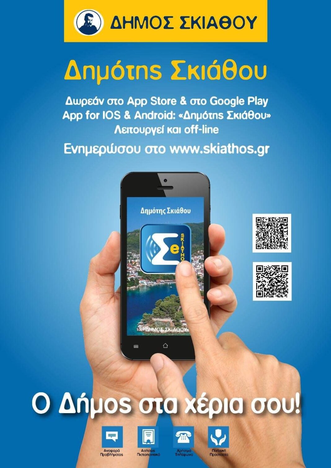Ο Δήμος Σκιάθου καλεί τους Δημότες Σκιάθου να κάνουν χρήση της καινούριας έκδοσης της εφαρμογής «Δημότης Σκιάθου», η οποία αναβαθμίστηκε για να ταιριάζει στα μέτρα του κάθε χρήστη. Μέσω αυτής οι Δημότες μπορούν να έχουν πρόσβαση στις ηλεκτρονικές υπηρεσίες του Δήμου, να υποβάλλουν τα αιτήματά τους και να ενημερώνονται. Η νέα έκδοση προσφέρει μία δυναμική αρχική σελίδα, η εμφάνιση της οποίας μπορεί να αλλάξει σύμφωνα με τις ανάγκες του χρήστη. Η εφαρμογή βασίζεται στην πλατφόρμα #CityzenApp #SmartCities #NovelTech