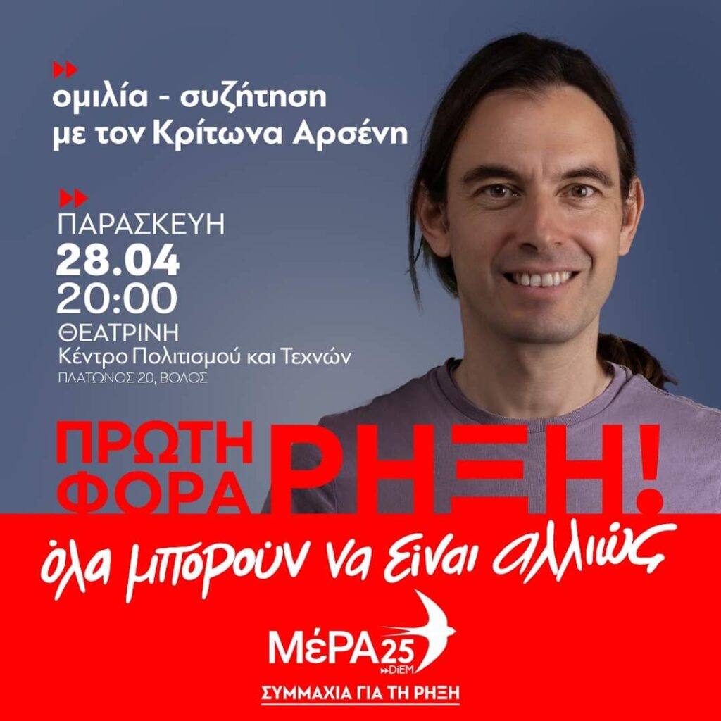 ΒΟΛΟΣ — Ομιλία – συζήτηση με τον Βουλευτή ΜέΡΑ25 Κρίτων Αρσένης αυτή την Παρασκευή 28/4, ώρα 20:00 στο «Θεατρίνη» Κέντρο Πολιτισμού και Τεχνών, Πλάτωνος 20, Βόλος.