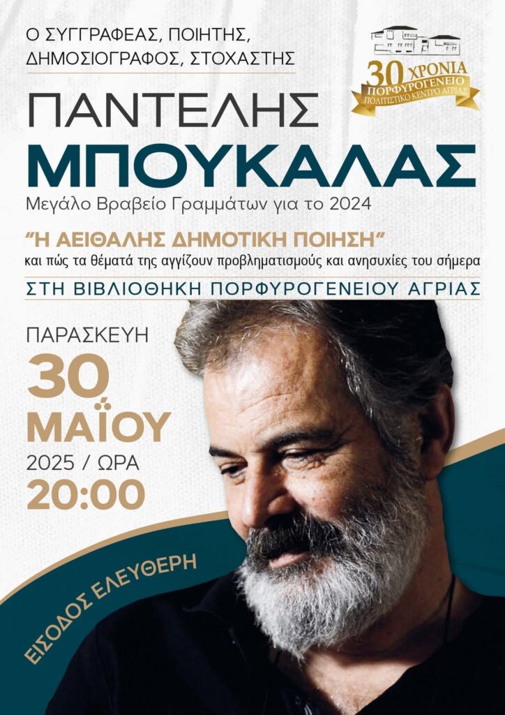 Στο Πορφυρογένειο Πολιτιστικό Κέντρο Αγριάς θεωρούμε εξαιρετική τιμή το γεγονός ότι ο κ. Μπουκάλας θα βρίσκεται κοντά μας για μια κουβέντα με το κοινό που θα ξεκινά από τη δημοτική ποίηση και το τραγούδι, ένα πεδίο έρευνας που τον απασχολεί διαχρονικά, για να συνεχιστεί σε κάθε τι σχετικό με τη γλώσσα, τα γράμματα, κοινωνικά ζητήματα και όποιο άλλο θέμα του καιρού μας.