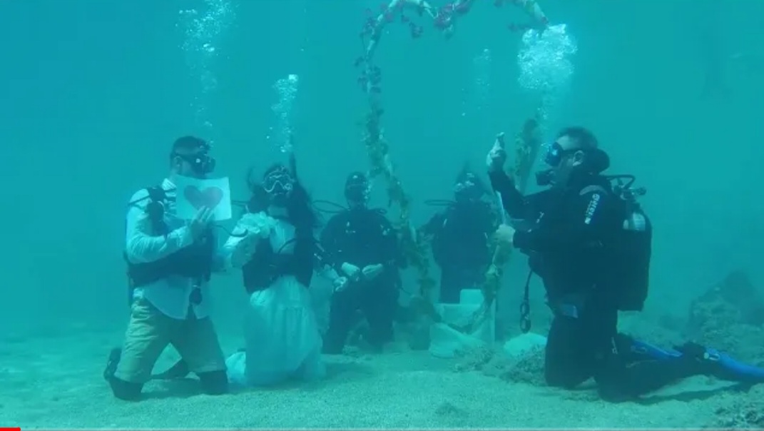 Στην Αλόννησο τελέστηκε ο πρώτος υποβρύχιος πολιτικός γάμος της Ελλάδας, τη Δευτέρα 29 Αυγούστου με πρωτοβουλία του Δήμου. Ο Πέτρος και η Μυρτώ αντάλλαξαν όρκους αιώνιας αγάπης και πίστης στο μαγευτικό βυθό της Αλοννήσου. Το ζευγάρι πάντρεψε ο Δήμαρχος Αλοννήσου Πέτρος Βαφίνης που είχε λάβει δίπλωμα κατάδυσης προκειμένου να τελεί γάμους κάτω από τα γαλαζοπράσινα νερά του νησιού. Παρόντες στο βυθό ήταν οι δύο κουμπάρες, η Πρόεδρος της Επιτροπής Τουρισμού Μαρία Αγάλλου που ανέλαβε τη γαμήλια διοργάνωση, καθώς και τρεις εκπαιδευτές καταδύσεων που εθελοντικά παρείχε το καταδυτικό κέντρο Triton Dive Centre. Αξίζει να σημειωθεί πως όλο το τελετουργικό τηρήθηκε κατά γράμμα μέσω της χρήσης ειδικών αδιάβροχων επιφανειών με όλα τα διαδικαστικά του πολιτικού γάμου καθώς και τα λόγια των νεόνυμφων, οι οποίοι και αφαίρεσαν προς στιγμήν τις μάσκες μετά την ανταλλαγή των όρκων για το πρώτο τους γαμήλιο φιλί. Χειριστής υποβρύχιας κάμερας βιντεοσκοπούσε το γάμο που μεταδόθηκε live stream σε μεγάλη οθόνη που είχε τοποθετηθεί στον γιαλό για τους προσκεκλημένους, ενώ παράλληλα υπήρχε η δυνατότητα παρακολούθησης και μέσω κινητού. «Είναι απερίγραπτα τα συναισθήματα που σε πλημμυρίζουν στο βυθό κατά τη διάρκεια του γάμου. Μέσα σε ιδανικές συνθήκες γαλήνης που προσφέρει η υποθαλάσσια φύση, ο χρόνος σταματά και η στιγμή αυτή ανήκει αποκλειστικά στο ζευγάρι», δήλωσε ο Δήμαρχος Αλοννήσου μετά την τελετή. Είχε προηγηθεί κάλεσμα του Δήμου Αλοννήσου την ημέρα του Αγίου Βαλεντίνου για την οργάνωση υποβρύχιων γάμων που αμέσως προκάλεσε το ενδιαφέρον ζευγαριών. «Στόχος μας είναι να “ανοίξουμε” μια νέα αγορά για την Ελλάδα και το νησί. Η Αλόννησος εξελίσσεται σε έναν διεθνή καταδυτικό προορισμό που φέτος επέλεξαν εκατοντάδες αυτοδύτες από όλο τον κόσμο. Γενικά, το νησί σημείωσε πολύ υψηλές πληρότητες σε όλη τη θερινή σεζόν που έφτασαν μέχρι το 100% για τον Αύγουστο, ενώ η τουριστική κίνηση θα συνεχιστεί μέχρι το πρώτο δεκαήμερο του Οκτωβρίου», συμπλήρωσε ο κ. Πέτρος Βαφίνης.