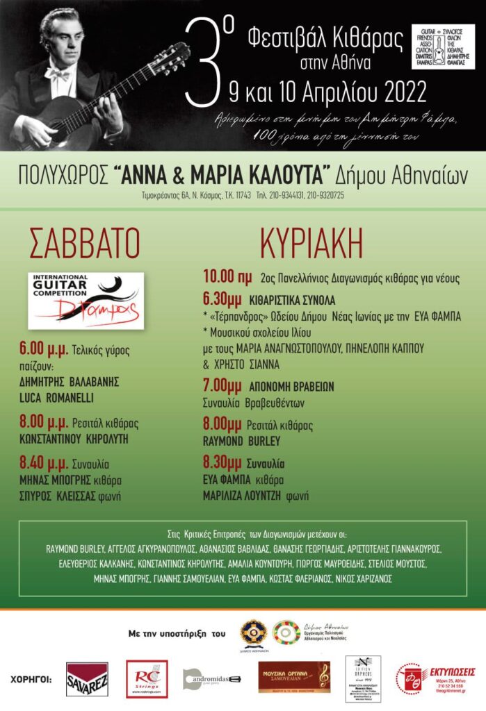 Εφέτος, και μετά την συμπλήρωση 100 ετών από τον θάνατό του, ο Σύλλογος Φίλων της Κιθάρας «Δημήτρης Φάμπας», τιμώντας την επέτειο αυτή, και θέλοντας παράλληλα να προσφέρει εκδηλώσεις υψηλής καλλιτεχνικής και εκπαιδευτικής ποιότητας, διοργανώνει στην Αθήνα το 3ο Φεστιβάλ Κιθάρας στις 9 και 10 του Απρίλη 2022. Μια διοργάνωση που περιλαμβάνει τον τελικό γύρο Διεθνή διαγωνισμού καθώς και διαγωνισμό νέων κιθαριστών, συναυλίες και ρεσιτάλ διάσημων ξένων και Ελλήνων κιθαριστών καθώς και συναυλίες συνόλων από ωδεία και μουσικά σχολεία.