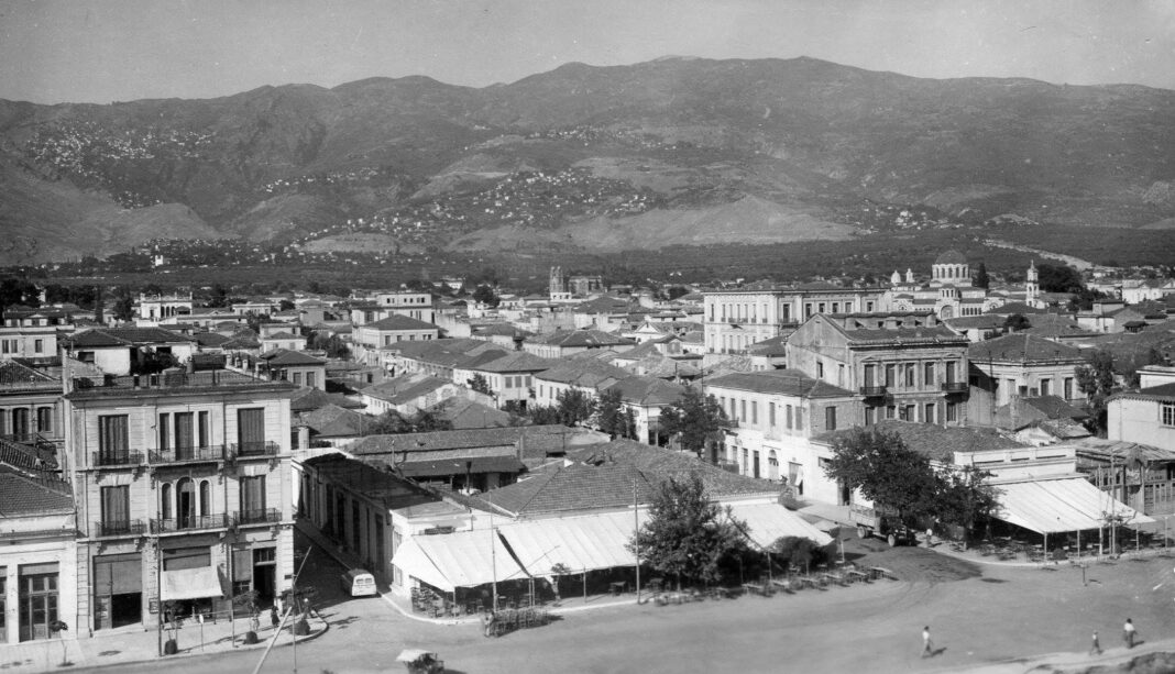Διακρίνονται το Δημαρχείο, το ξεν/χείο Γαλλίας , ο Αγ. Γεώργιος Μπαξέδων, η παλιά μεγάλη πετρόχτιστη Ανάληψη, η Καθολική εκκλησία